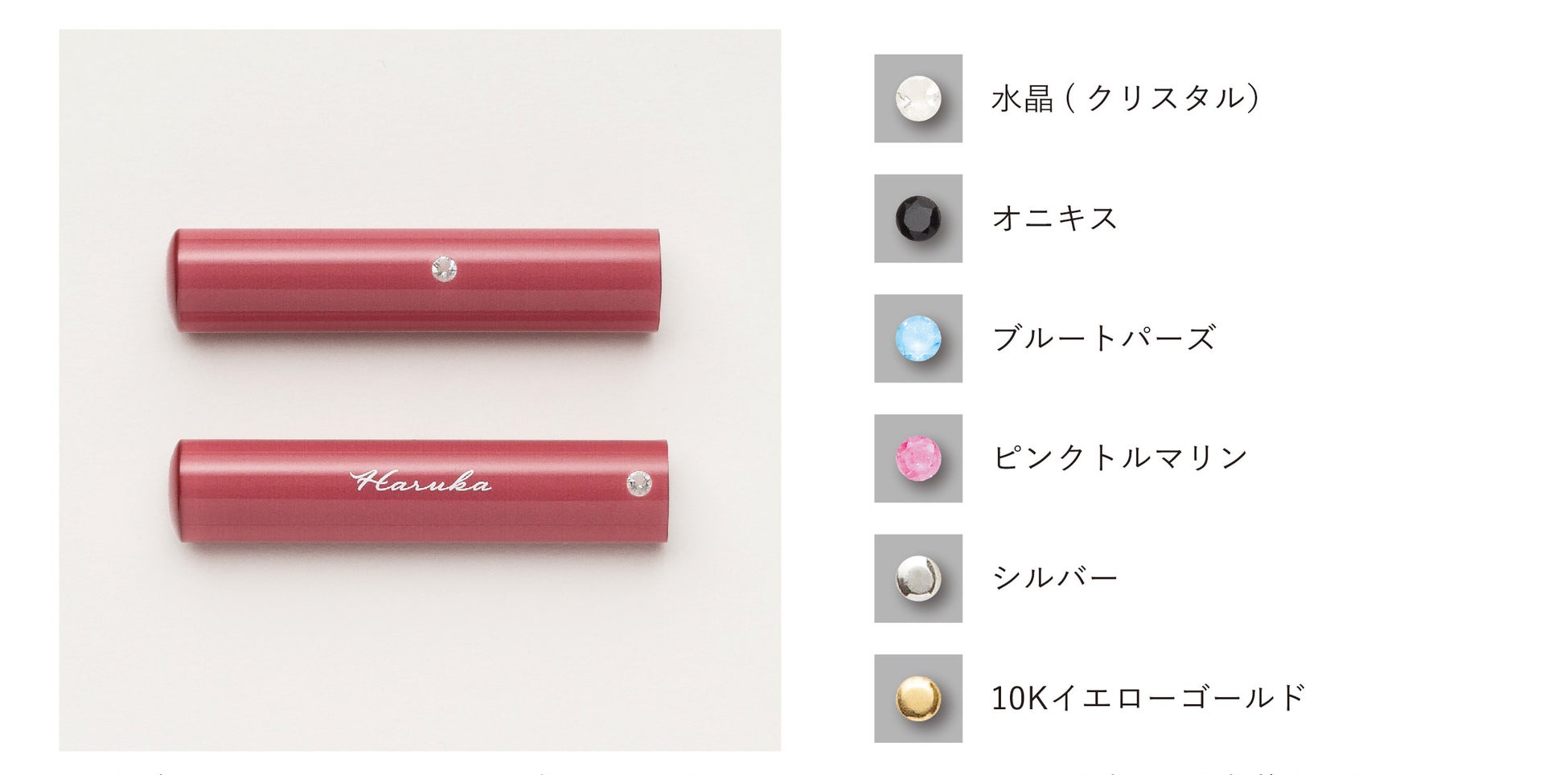 印影の上下が判別しやすくなる目印(アタリ)として、印鑑側面にストーンなどを入れることができます。さまざまな特性をもつストーンやジュエリーの全6種類からお選びください。ジュエリーを製作する職人がラウンドカットで一つひとつ手作業で製作いたします。