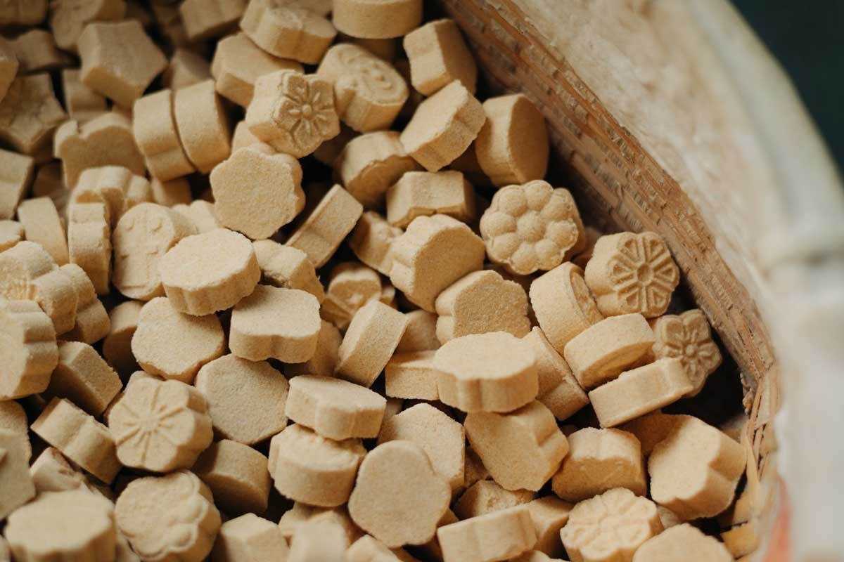 1927年、清澄白河で創業。東京に残る数少ない「落雁」専門の和菓子メーカー。くちどけの良い商品は、神社向けのOEMや土産物店への卸により、多くの参拝客・観光客に愛されている。落雁とは、お米や麦、豆などの穀類をすり潰した粉に水飴や砂糖を混ぜ、型に押し固めて乾燥させた干菓子で、非常に堅いイメージだが、日親製菓は「親しみやすい和菓子」を目指し、口溶けのいい柔らかさを追求した、「硬くない落雁『ソフト落雁』」で専業化。商品開発にも積極的で、あんこを入れたソフト落雁「あん家紋」は大ヒットを記録、ロングセラーとして今日も親しまれている。 現在は定番の「あん家紋」のほか、桜の花の形と桜葉パウダーの香りも楽しめる「あん桜」など、およそ10種類のソフト落雁を展開している。独特のやわらかさに加え、原材料に油脂を一切使用せず、本来の自然の味と香りを大切にしている。