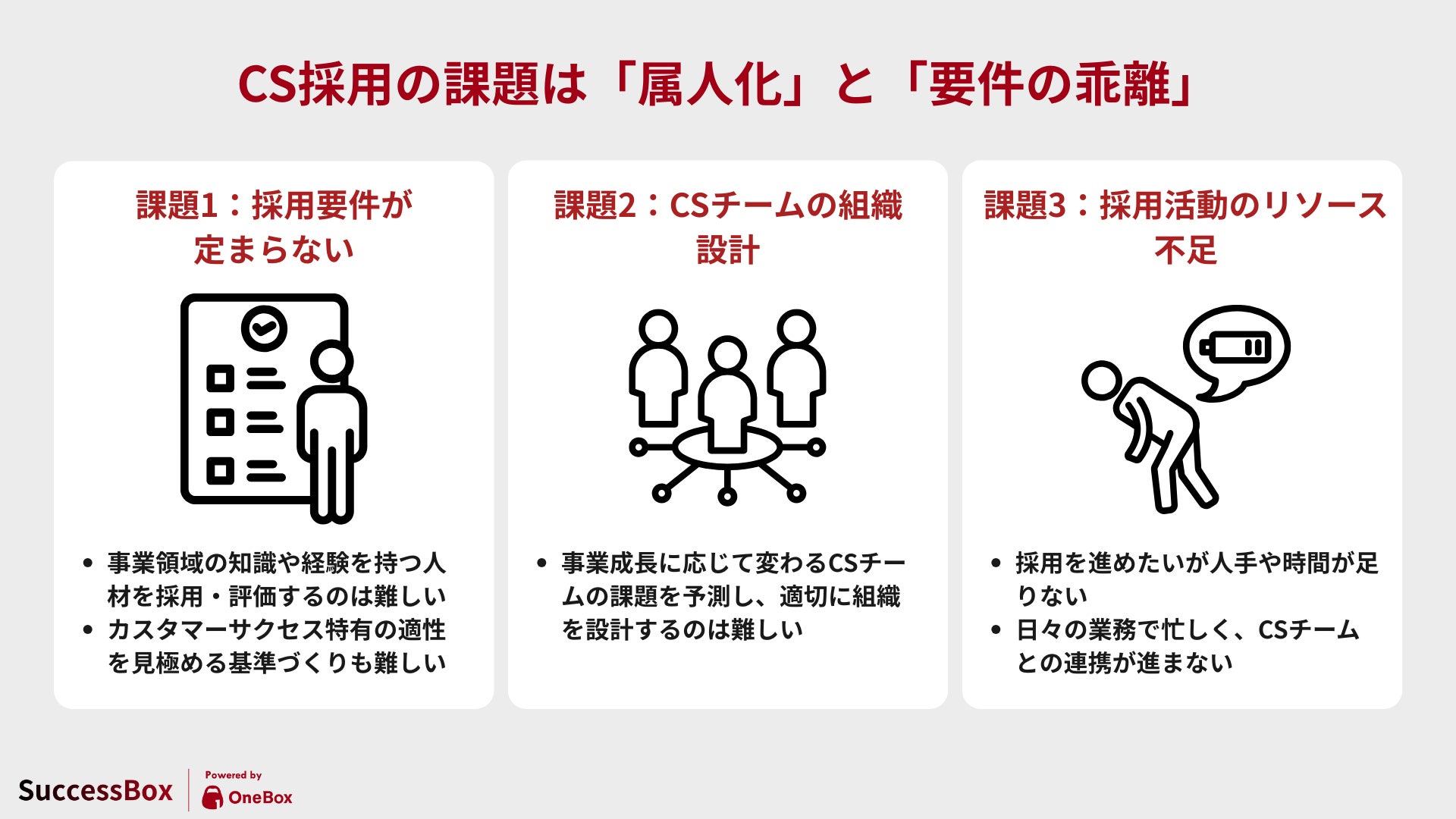 その結果、優秀な人材が採用されても適切にCSに配置されなかったり、CSの魅力を候補者に伝えきれずに採用競争に負けてしまうなど、企業の成長を支えるCS体制の構築の大きなハードルとなるケースが顕在化しています。