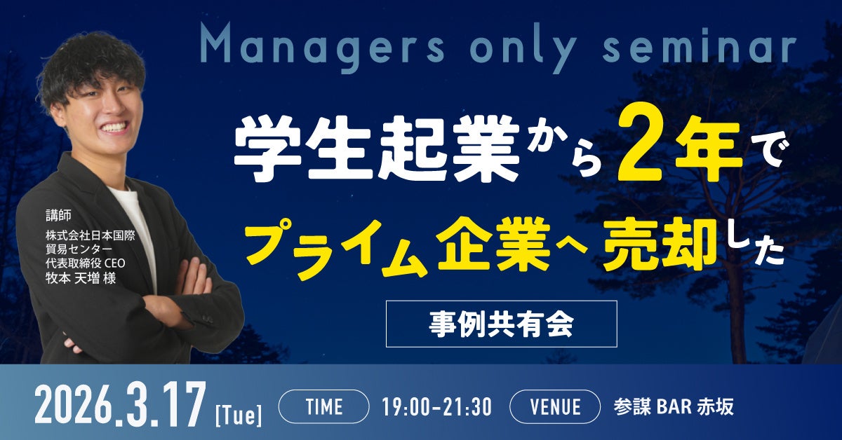 創業2年で東証上場企業へ数十億円規模の事業売却。営業利益率50%超を実現した学生起業家・牧本天増氏が登壇する経営者向け勉強会を3月17日に開催