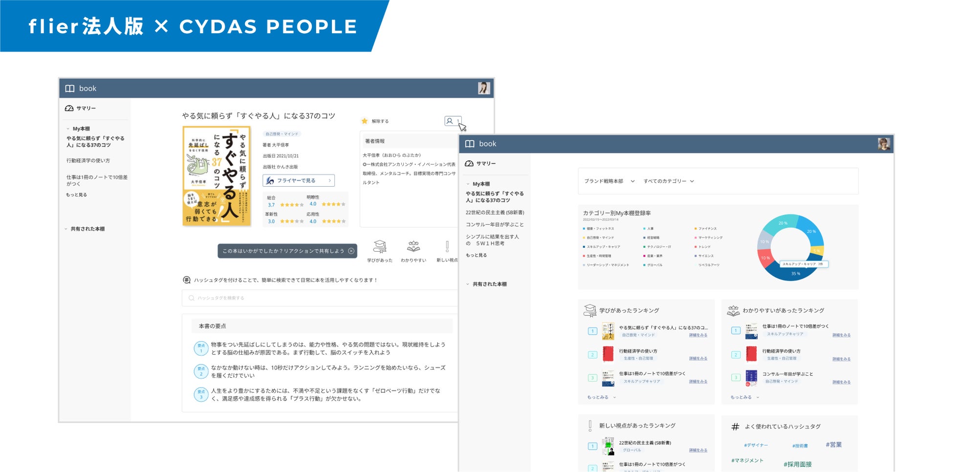 組織全体の成長を促す研修ツールとして「flier法人版」をご提供いただき、CYDAS PEOPLE上で利用状況データを業務指標と紐づけることで、組織全体の底上げを図ることが可能となります。書籍から得られる普遍的かつ本物の「知」を刺激剤として、多様な規模・業種の企業様の組織開発に寄与していきます。