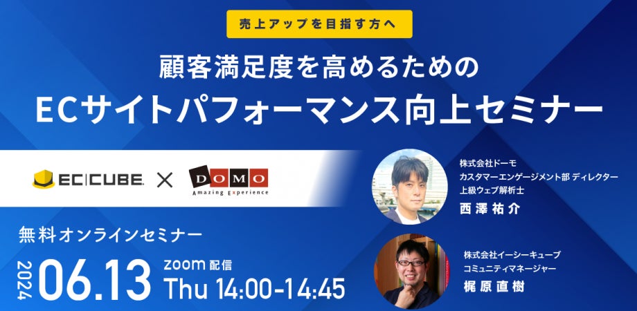 日本中のWebサイトを速くし“快適にする”を理念に、Cloudflare(クラウドフレア)公式認定パートナーとしてWebサイトを早くするための事業を展開している株式会社ドーモ(本社:東京都中央区、代表取締役:占部雅一)は、35,000以上の店舗数を誇る国内No.1シェアのオープンソースECパッケージ「EC-CUBE」を開発・展開する株式会社イーシーキューブ(本社:大阪府大阪市北区 代表取締役:岩田 進 以下、イーシーキューブ)と協力し、2024年6月13日(木曜日)にオンラインセミナー『顧客満足度を高めるためのECサイトパフォーマンス向上』を開催します。