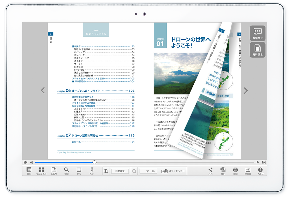 手軽にデジタルブックを作成できる『Wisebook』は、事前に撮影したレクチャー動画を添付したり、目隠し機能を使った簡単なテストの配信などもでき、多くの機能を持ち合わせています。カタログやマニュアルだけでなく、プリント類の配布などにもご利用いただけます。