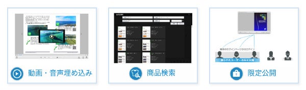 動画や音声ファイルを埋め込んでデジタルブック上で再生することができます。マニュアルの手順を具体的に解説する際や、カタログの掲載商品のプロモーション、録画データのアーカイブとしての添付などに活用いただけます。