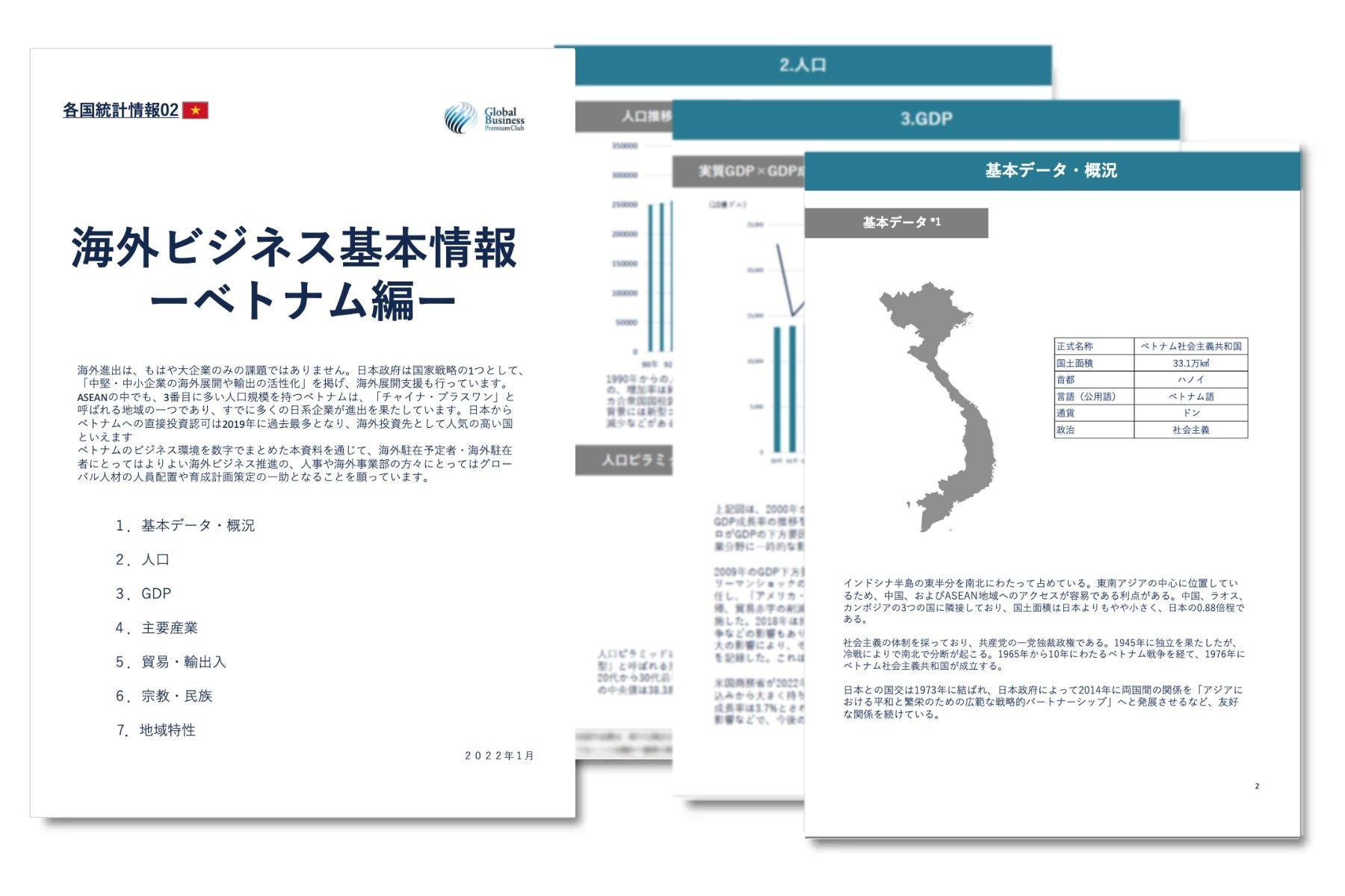 ベトナムへの海外進出を検討中の企業へ、市場調査の第一歩に必要となるビジネス環境(人口、GDP、主要産業、貿易・輸出入、宗教・民族/人種、地域特性)に関するレポートをまとめました。