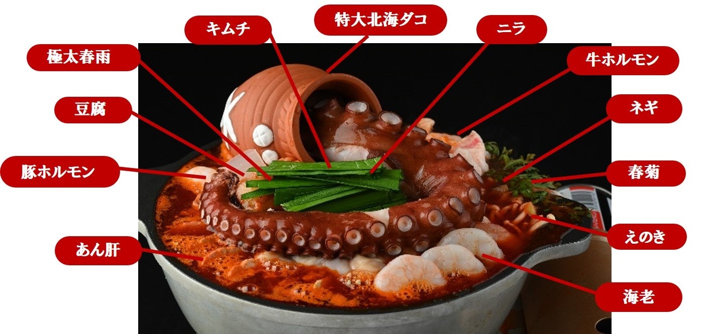 食材:特大北海ダコ、海老、牛豚ホルモン、あん肝、