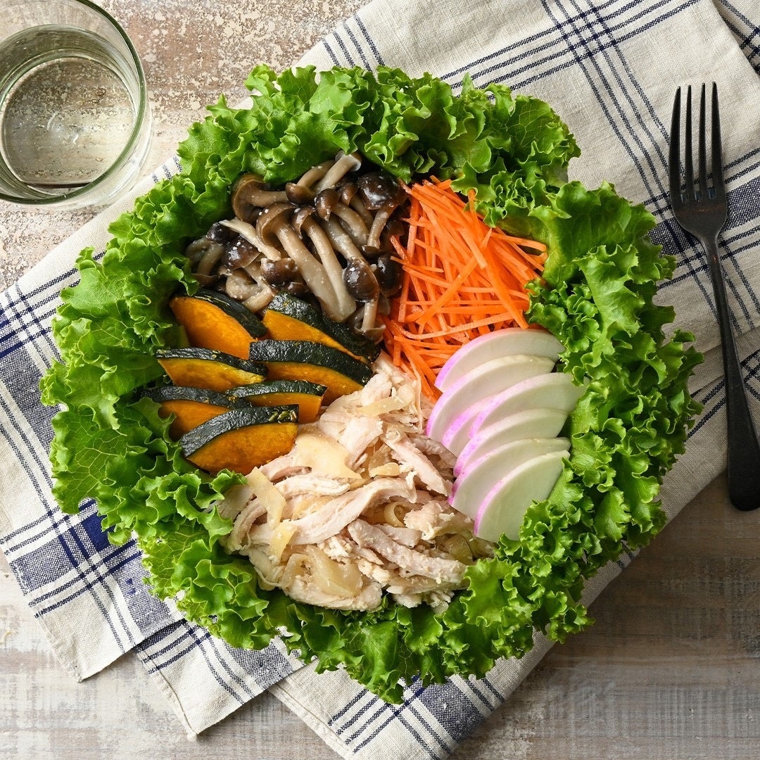 国産鶏むね肉を使用した「ジンジャーチキン」には、ガリとすりおろし生姜、塩麹がしっかり染み込んでいます。みずみずしい食感の「あやめ雪かぶ」はきれいな紫色が特徴で、冬を感じさせるサラダです。