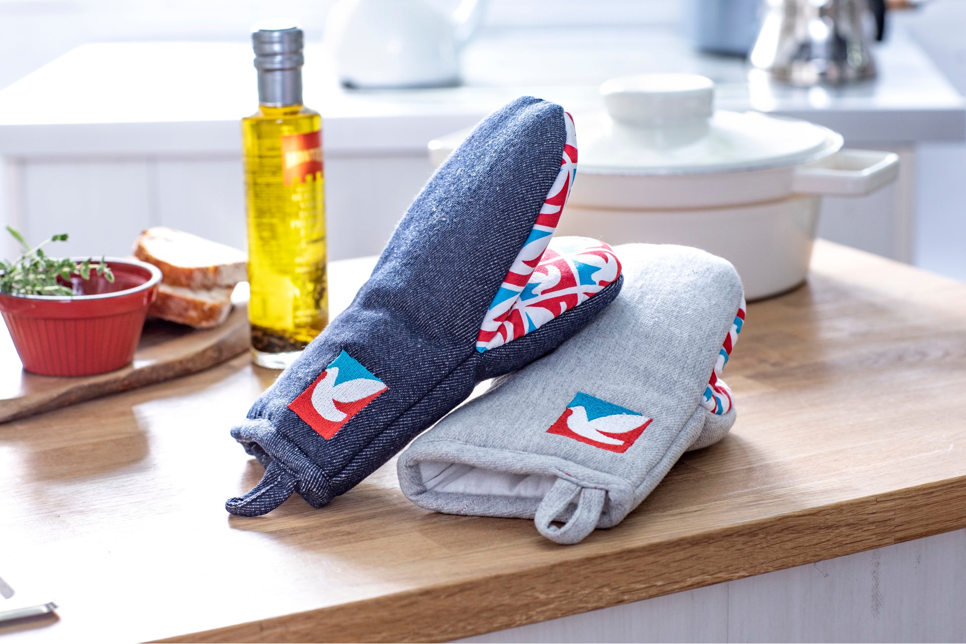 インパクト大なハト柄の鍋つかみ。全2デザインで展開します。