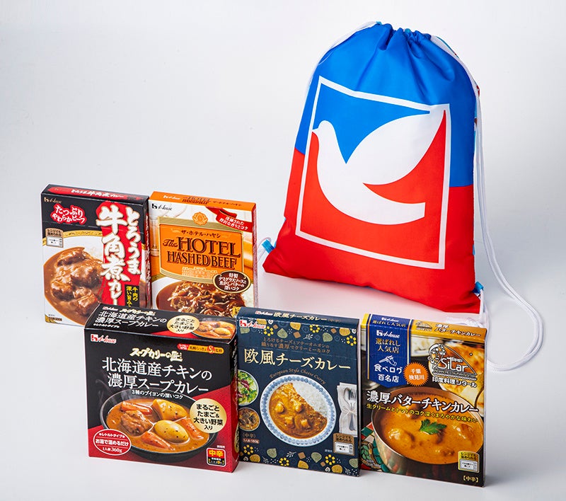 ハウスレトルトカレー5種が楽しめるお買い得セット。備蓄品としても役に立つレトルトカレーがオリジナルナップサックに入った特別提供品です。