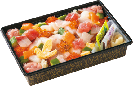 まぐろ、いくら、サーモン、ぶりなど人気のネタを彩りよくのせたバラちらしに、ロゴマークのハト型玉子をトッピングしました。