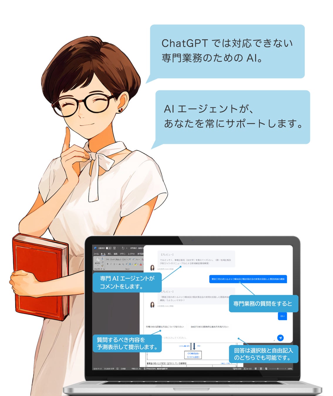 補助金をマスターしたAIエージェントとチャット形式で会話するだけで、審査員目線のアドバイスや事業計画書の修正など「どうすれば採択されるのか?」を丁寧に教えてくれます。