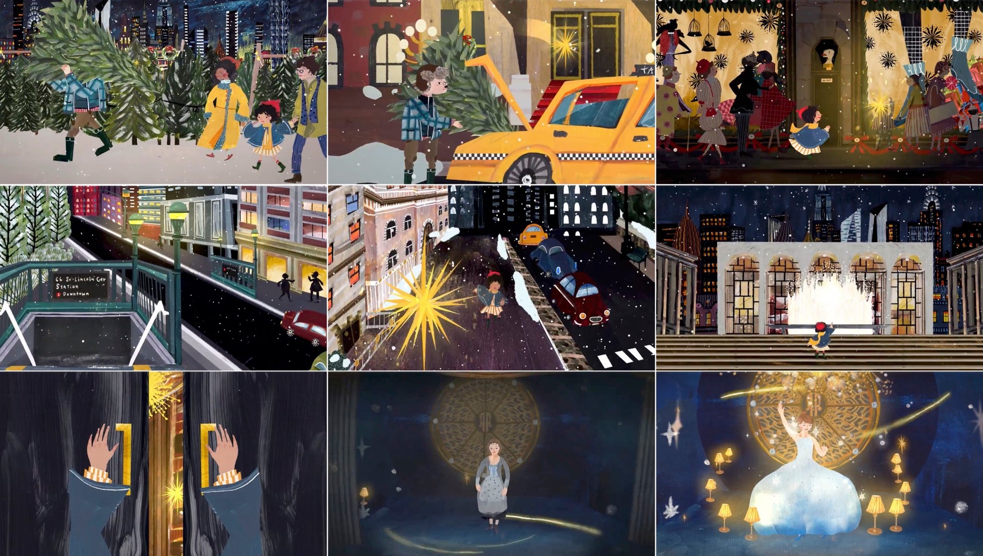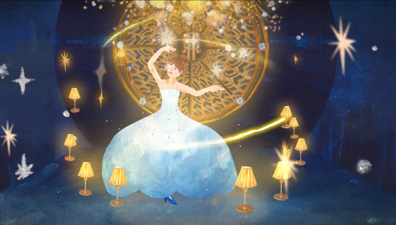 METのオペラ劇中の見どころの一つが、その衣装デザイン。繊細で生き生きとした衣装とのバランスをとるために、キャラクターデザインはダイナミックで誇張された、遊び心のあるタッチで描きました。またキービジュアルには、シンデレラが魔法をかけられる瞬間を採用。ミニマル、エレガントでありながらも華やかなドレスを引き立てるブルーを、特徴的なグラデーションで表現しました。ストップモーションアニメーションは、現地のエージェンシーの協力を得て制作。まるで魔法の街のようなきらめくニューヨークの様子、またエンディングはシンデレラの衣装が変わる瞬間を捉えたシーンとなっています