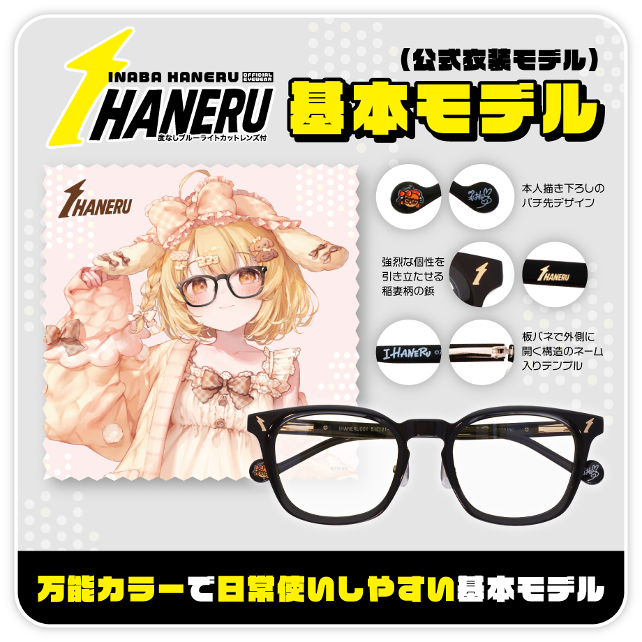 IHANERUは、因幡はねるさんが製作前の初期打合せ段階から関与し、フレームのシルエット、テンプルの形状、カラー配色、稲妻モチーフの鋲デザイン、バチ先の手書きイラストに至るまで、ご本人が決定されたプロデュース眼鏡です。