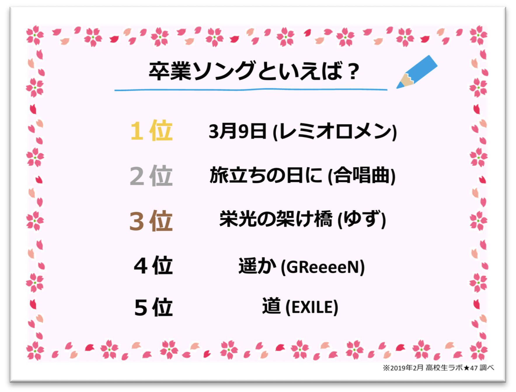 その為、生徒に聞き馴染みのあるJ POPが卒業式の新定番ソングとして多くランクインしたと思われます。
