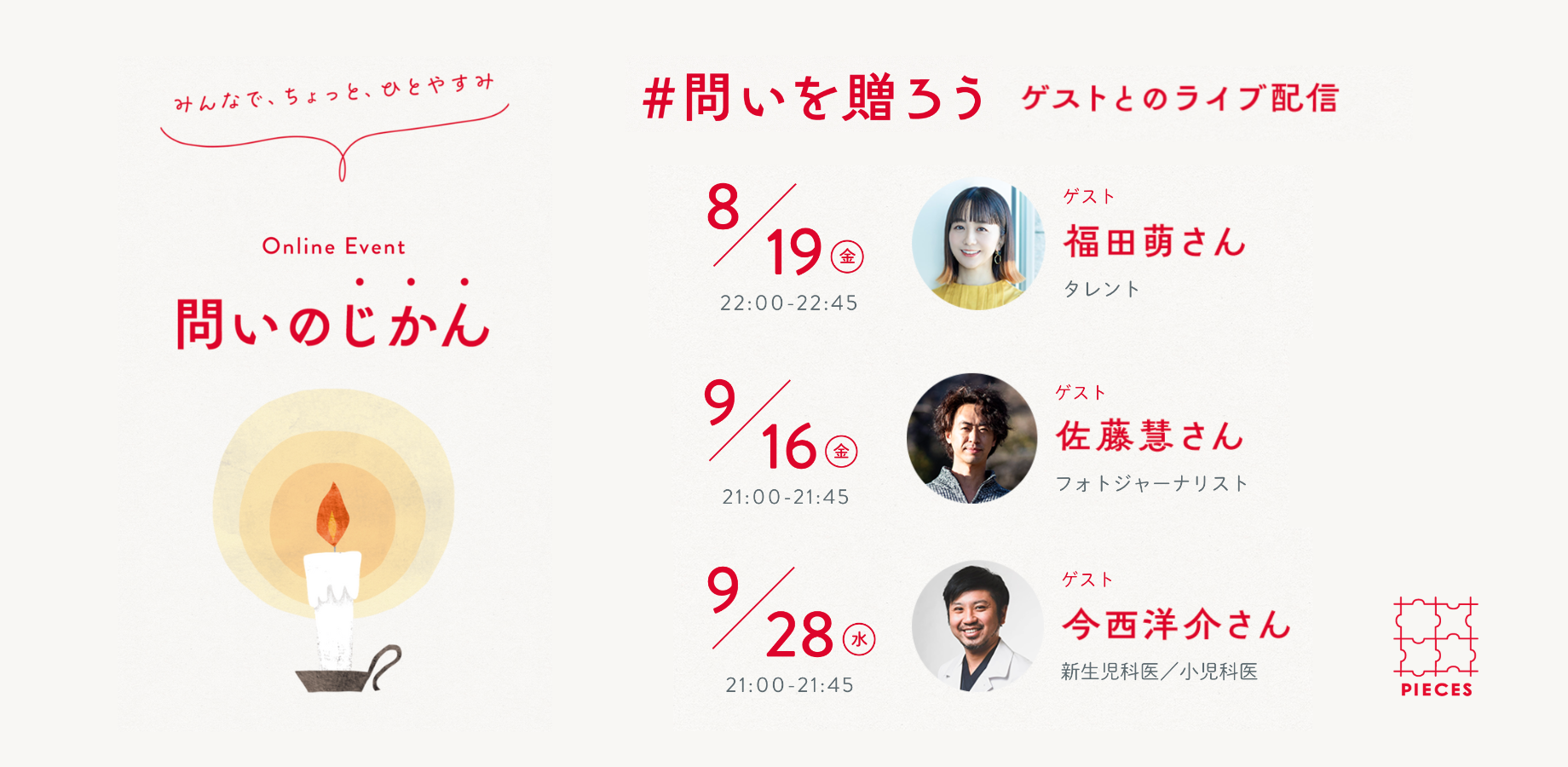キャンペーンの一環として、タレントの福田萌さん、フォトジャーナリストの佐藤慧さん、新生児科医の今西洋介さんをお招きするオンラインイベント「問いのじかん」を開催します。PIECESの代表理事で、児童精神科医の小澤いぶきがゲストと共に、「問い」を深めます。