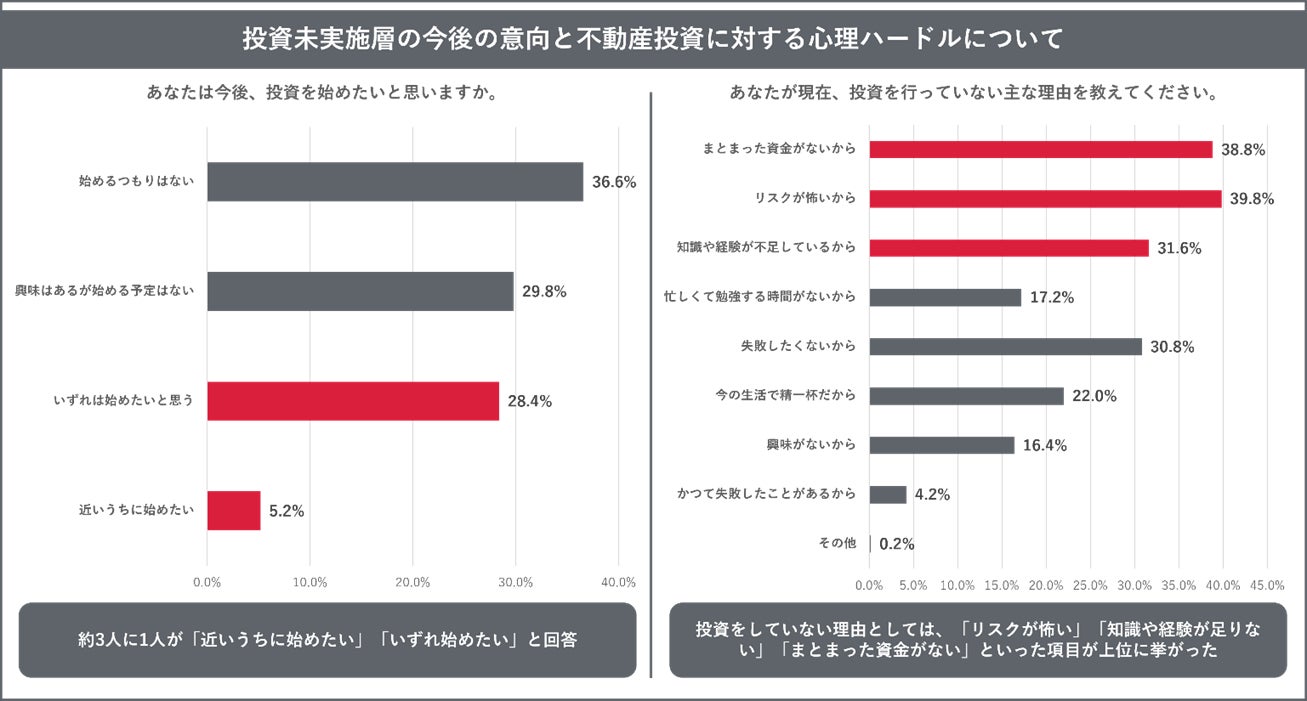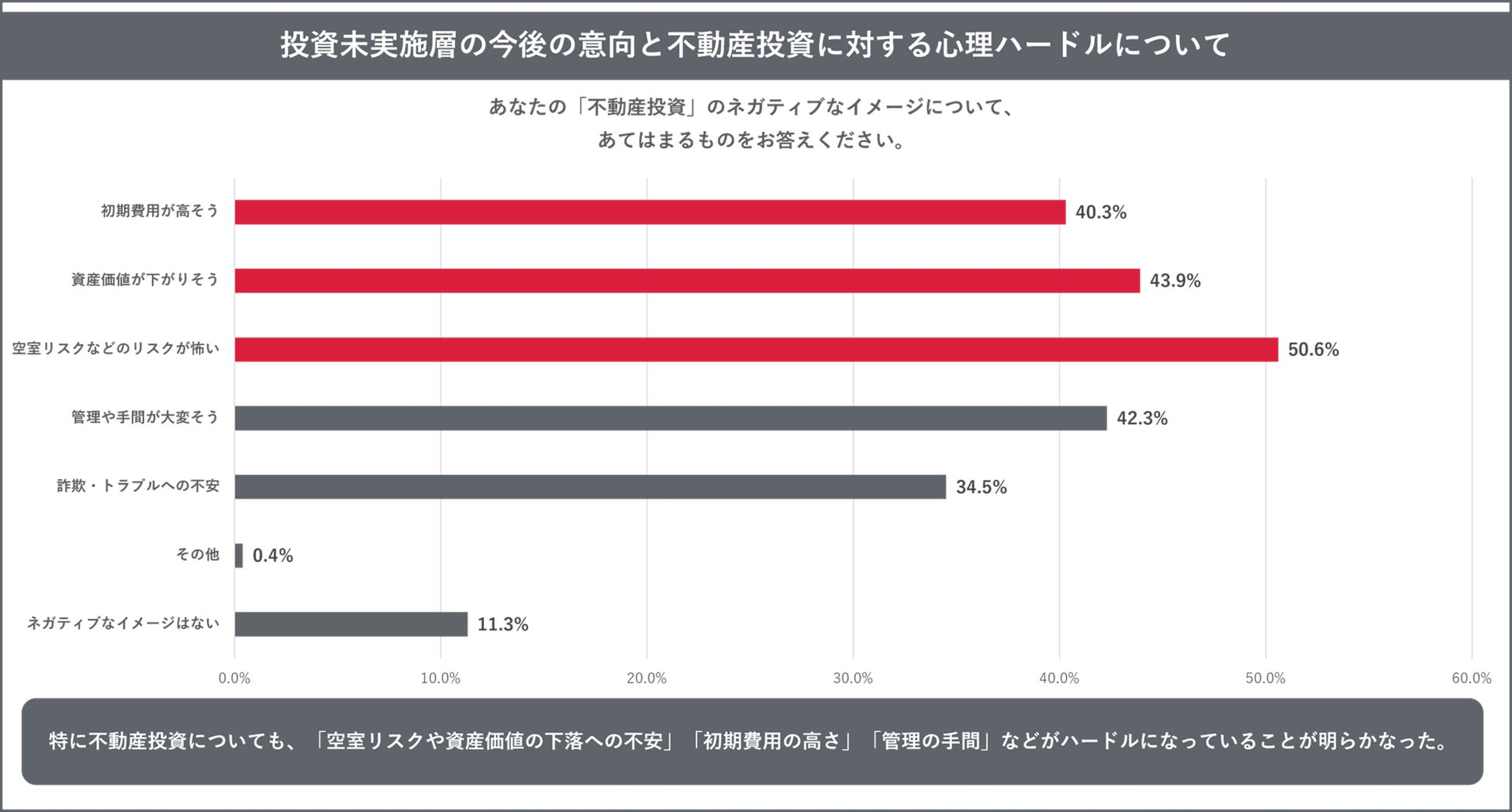 現在投資をしていない層に今後の意向を聞くと、約3人に1人が「近いうちに始めたい」「いずれ始めたい」と回答しました。一方で、「興味はあるが始める予定はない」「始めるつもりはない」と答えた人も合計で約2/3を占めており、「関心はあるが一歩踏み出せない」層が多いことが分かります。投資をしていない理由としては、「リスクが怖い」「知識や経験が足りない」「まとまった資金がない」といった項目が上位に挙がり、特に不動産投資についても、「空室リスクや資産価値の下落への不安」「初期費用の高さ」「管理の手間」などがハードルになっていることが明らかになりました。