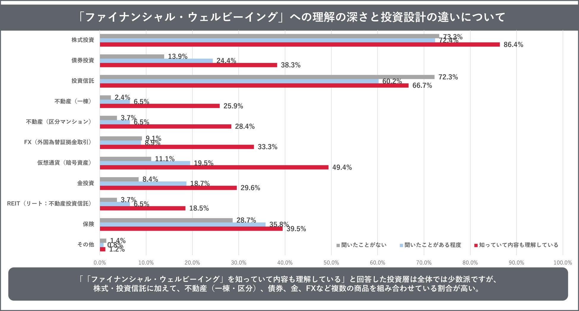 「ファイナンシャル・ウェルビーイング」を理解している投資層は、株・投信に加えて不動産、債券など複数資産を組み合わせる割合が高い。