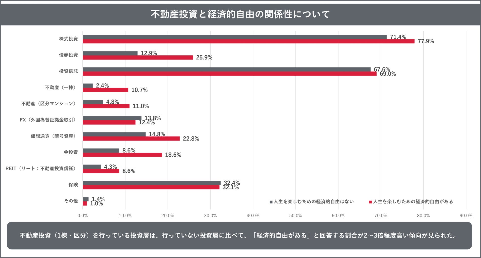 投資商品の内訳と「人生を楽しむための経済的自由」の有無を掛け合わせてみると、不動産投資(1棟・区分)を行っている投資家は、行っていない投資家に比べて、「経済的自由がある」と回答する割合が2〜3倍程度高い傾向が見られました。