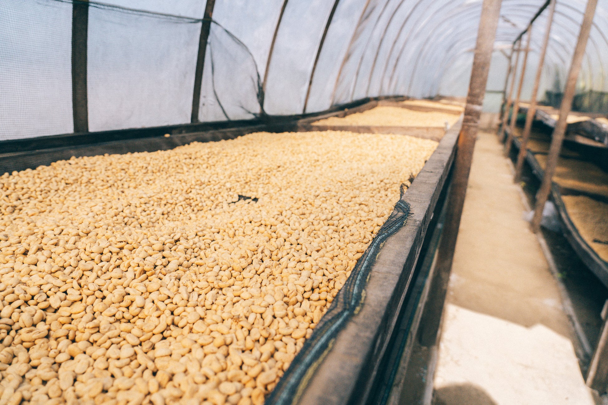コーヒーチェリーの熟度選別用の台に、小さな皮むき機、水洗用の桶と、発酵用の小さなタンク、1つの外の乾燥台と、3つの乾燥用グリーンハウスだけを揃えた精製所です。