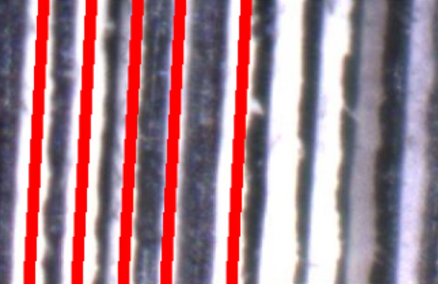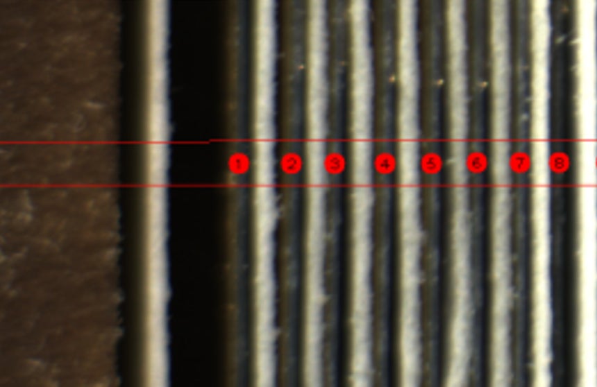 ai-Numbers はAI(ディープラーニング)を用い、端面の色・模様・テクスチャといった二次元的特徴を抽出します。これにより、複雑な端面を持つ電子基板や変化の大きな断面をもつシート製品も正確にカウントすることができます。最大5,400ピクセルの高解像度で端面を捉えるため、従来の画像枚数計数機では不可能だった0.05mmの薄物シートも計数可能です。