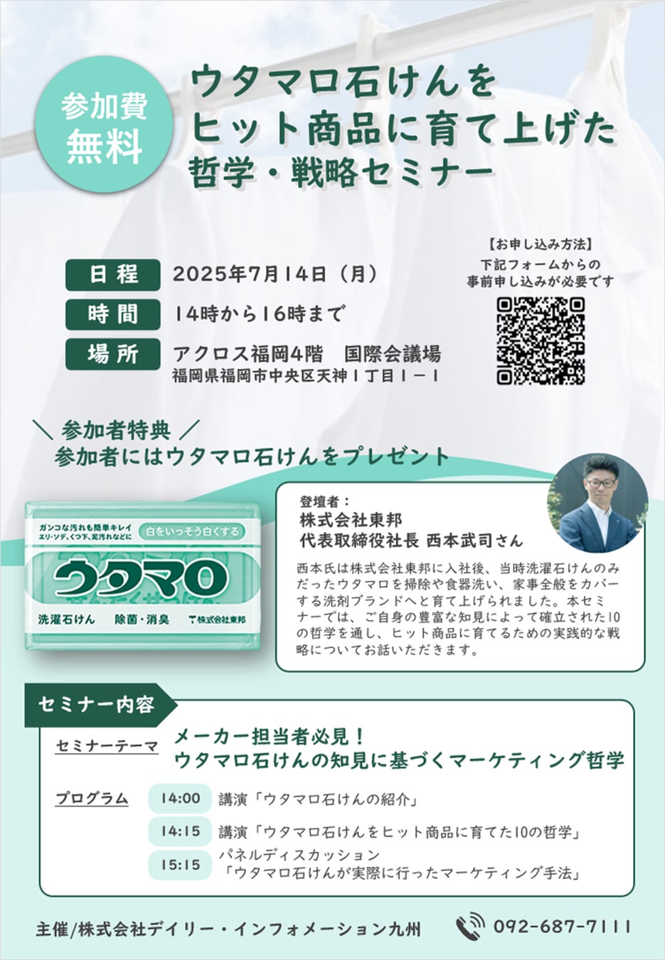 株式会社デイリー・インフォメーション九州は、2025年7月14日(月)にアクロス福岡4階 国際会議場(福岡県福岡市中央区天神1丁目1-1)にて、セミナー「ウタマロ石けんをヒット商品に育て上げた哲学・戦略セミナー」を開催いたします。