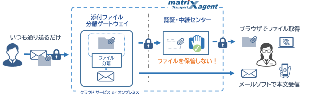 受信者が、「matriXagent(マトリックスエージェント) クラウド中継センター」に対して認証情報とファイルリクエストを送ると、送信者が管轄するメールゲートウェイに保管された添付ファイルを、クラウド中継センターが取り次いで転送します。受信者は添付ファイルを受け取るために一度だけパスワードを設定する必要がありますが、送信者とパスワードを共有する必要もなく、送信者が受信者のアカウントを管理する手間もありません。