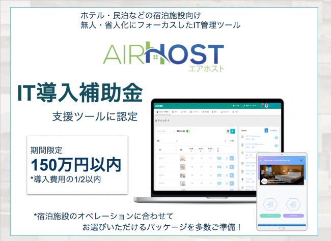 株式会社エアホスト(本社:神奈川県川崎市、 代表取締役:尾畠 隆志、以下 エアホスト)が提供するクラウドサービス「AirHost PMS」セルフチェックインアプリケーション「AirHost Check-in Solution」は、2019年6月4日にIT導入補助金対象に認定されました。