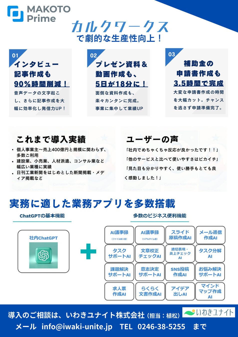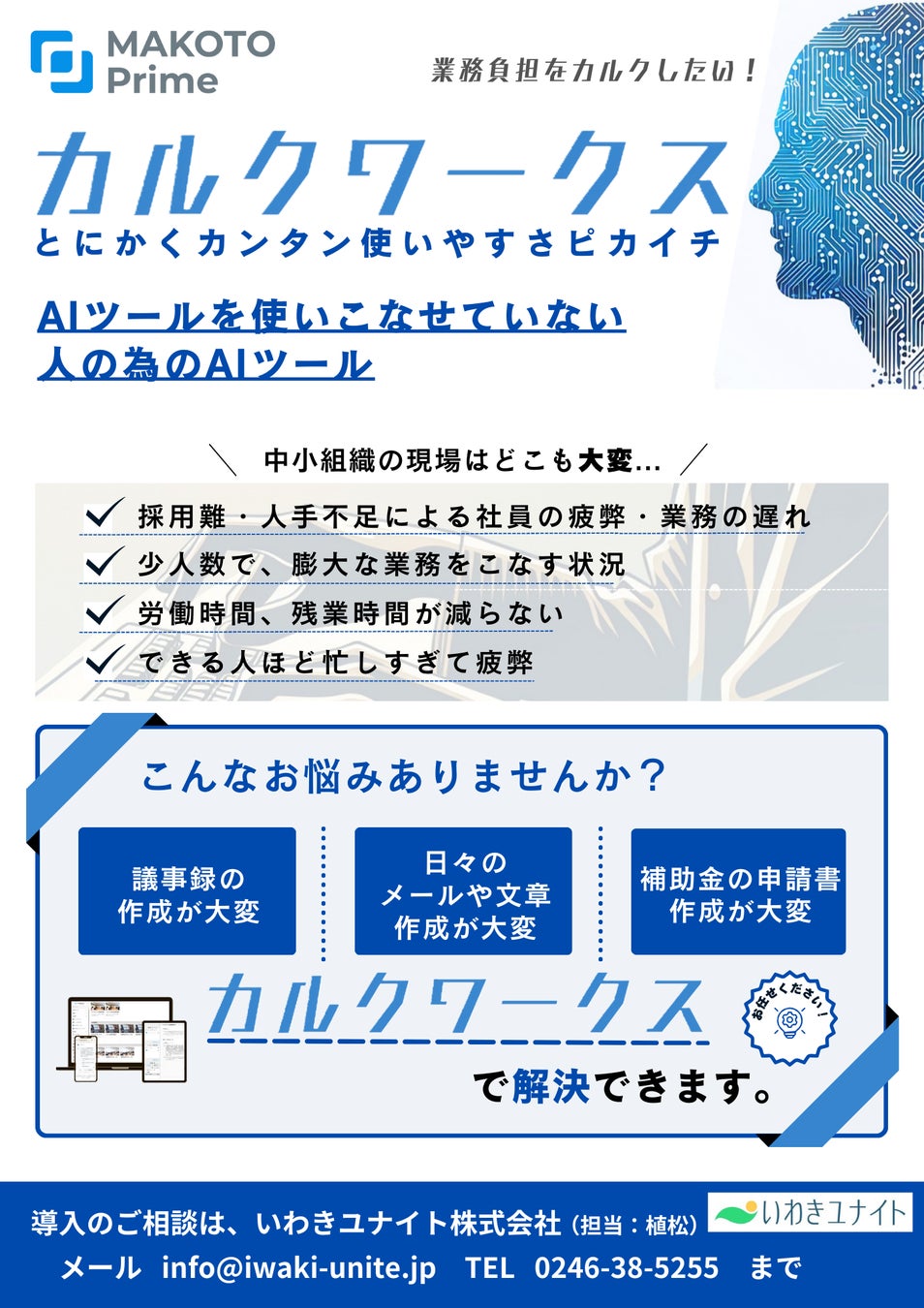 いわきユナイト株式会社(本社:福島県いわき市、代表取締役:田子 哲也、植松 謙、以下「当社」)は、このたび株式会社MAKOTO Prime(本社:宮城県仙台市、代表取締役:竹井 智宏)と生成AIツール「カルクワークス」の販売パートナー契約を締結したことをお知らせいたします。