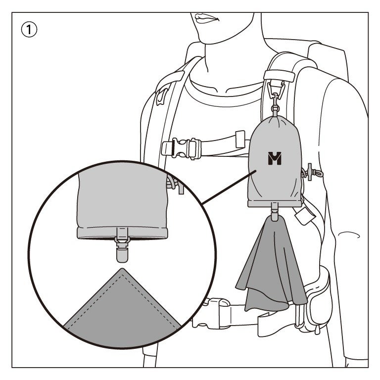 片手で操作可能な、イージーアクセスタイプの開口部を備えた深型形状のマルチケース。使用用途によって、上下お好きな向きでリュックのショルダーハーネスに簡単に取り付けることができ、アウトドアや旅行に必要な小物やアイテムへ簡単にアクセス・収納することができます。本体には軽量で耐久性の高いポリエステル生地を採用。手のひらサイズになる収納袋が付属しています。