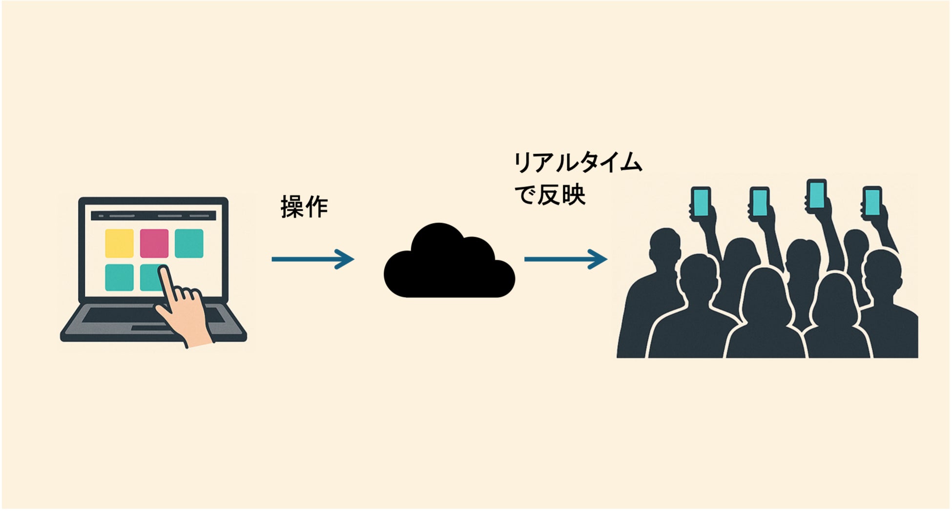 近年、ライブイベントやファンミーティングにおいて、観客との一体感を高める演出が求められています。 特に、独自の世界観を大切にするアーティストのプロデューサーやマネージャーにとって、手軽に導入できる演出ツールのニーズが高まっています。 従来の光を使った演出では業者との打ち合わせや大掛かりな設営が必要で、実現が難しかった演出も、クラウド化により自前で実現可能となりました。