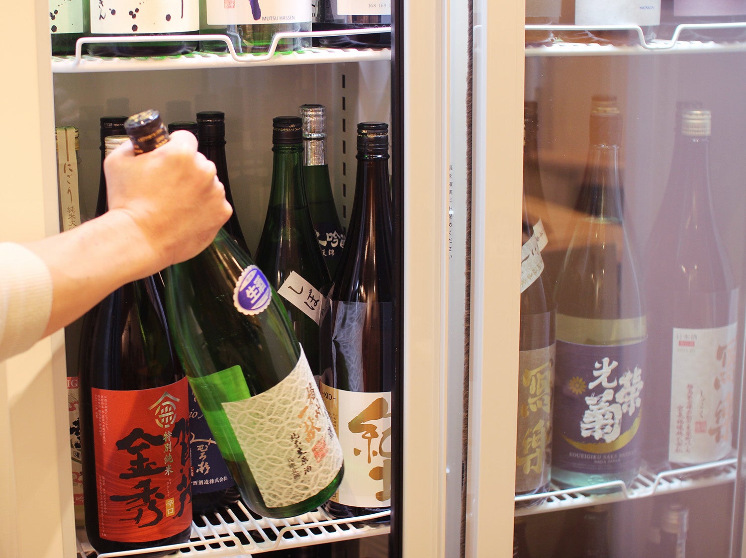 フロアに設置された冷蔵庫にはびっしりと数十種類の日本酒が並べられている。取り揃える日本酒は、どれも絶対的な自信を持っておすすめできるものばかり。それらをほとんど飲み放題で提供する。