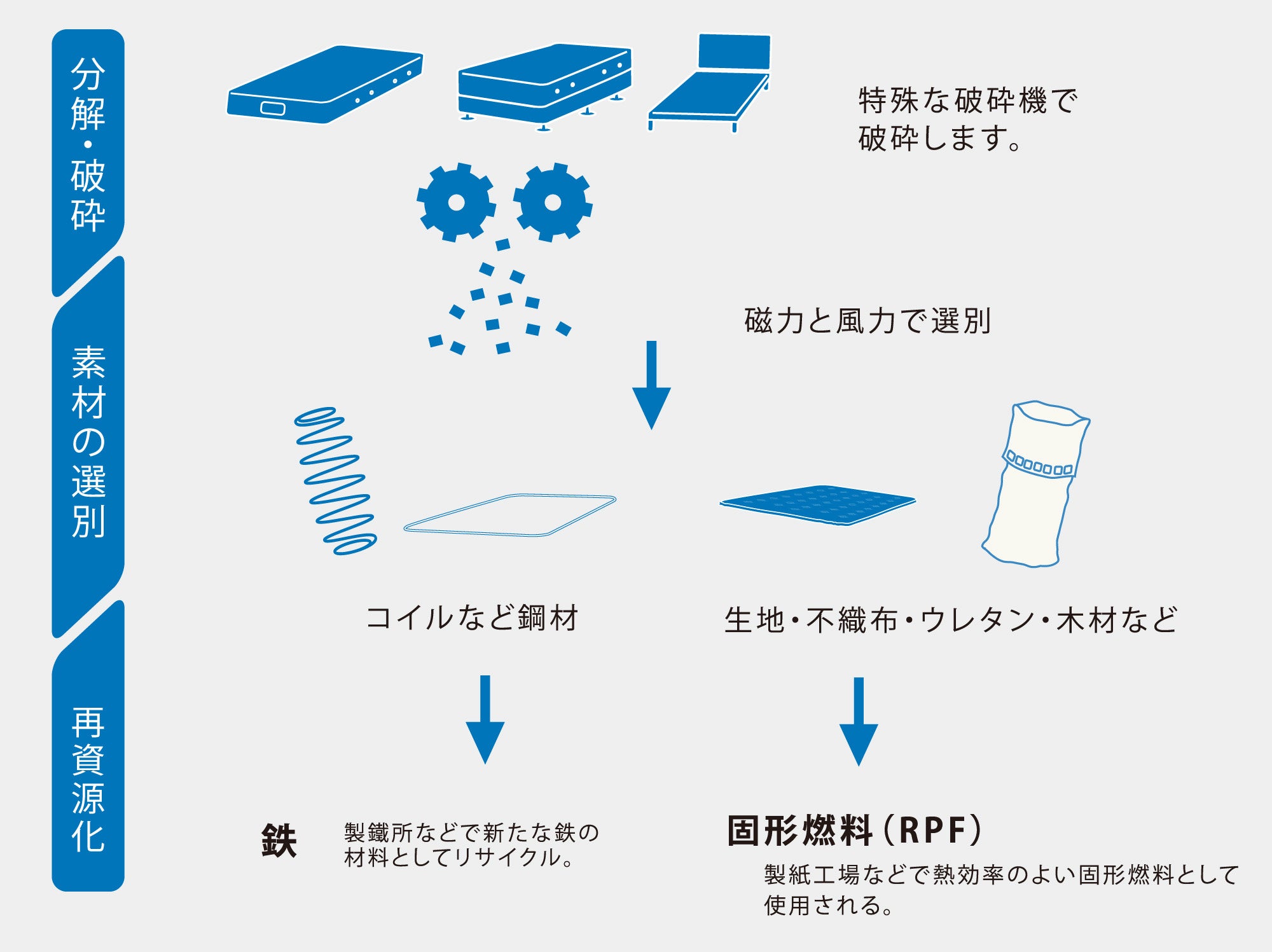 回収されたマットレス・ボックススプリング・付属ベッドフレームは、提携処理施設において「分解・破砕」⇒「素材の選別」⇒「再資源化」されます。「コイルなど鋼材」は新たな鉄の材料として、「生地・不織布・ウレタン素材・木材等」は熱効率の良い固形燃料(RPF)として、100%再資源化されます。