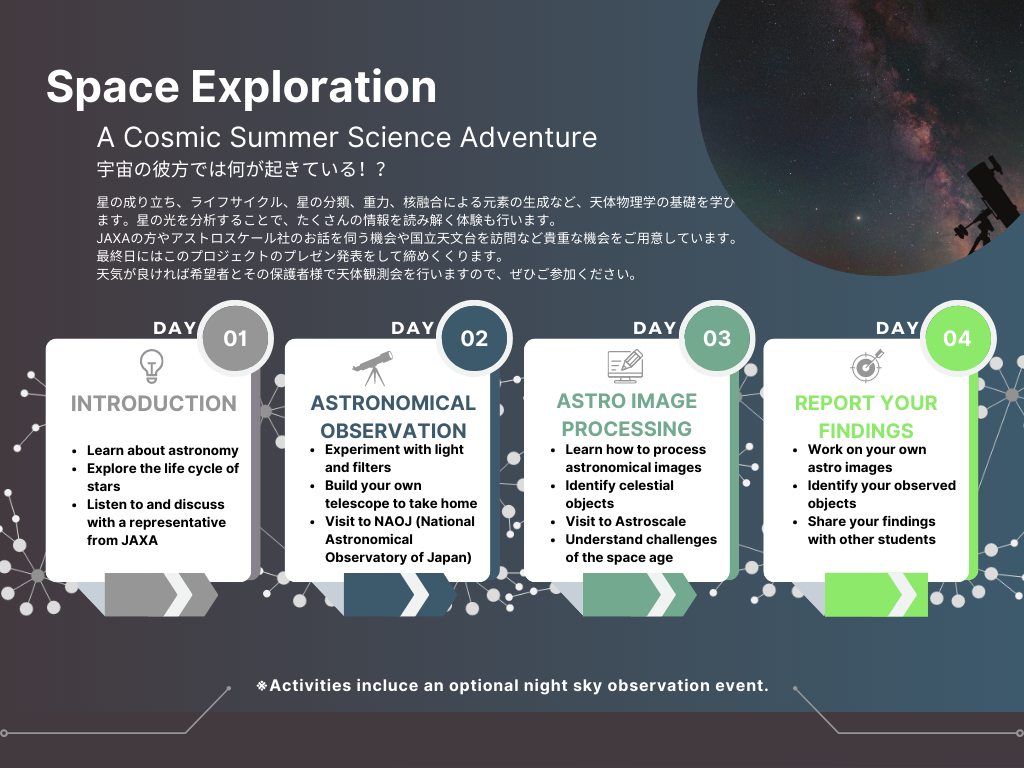星の成り立ち、ライフサイクル、星の分類、重力、核融合による元素の生成など、天体物理学の基礎を学びます。星の光を分析することで、たくさんの情報を読み解く体験も。JAXAやアストロスケール社の方にお話を伺ったり、国立天文台を訪問するなど貴重な機会を用意しました。最終日は、プロジェクトのプレゼン発表で締めくくります。天気が良ければ、希望者と保護者が参加可能な天体観測会を行います。