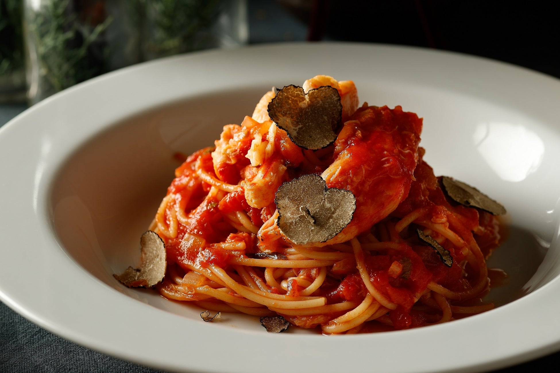 自家製のパスタに活オマールロブスターをふんだんに使用し、ピリッとした辛味が特徴の濃厚なディアボロソースをあわせ、トリュフをトッピングした贅沢な一皿です。
