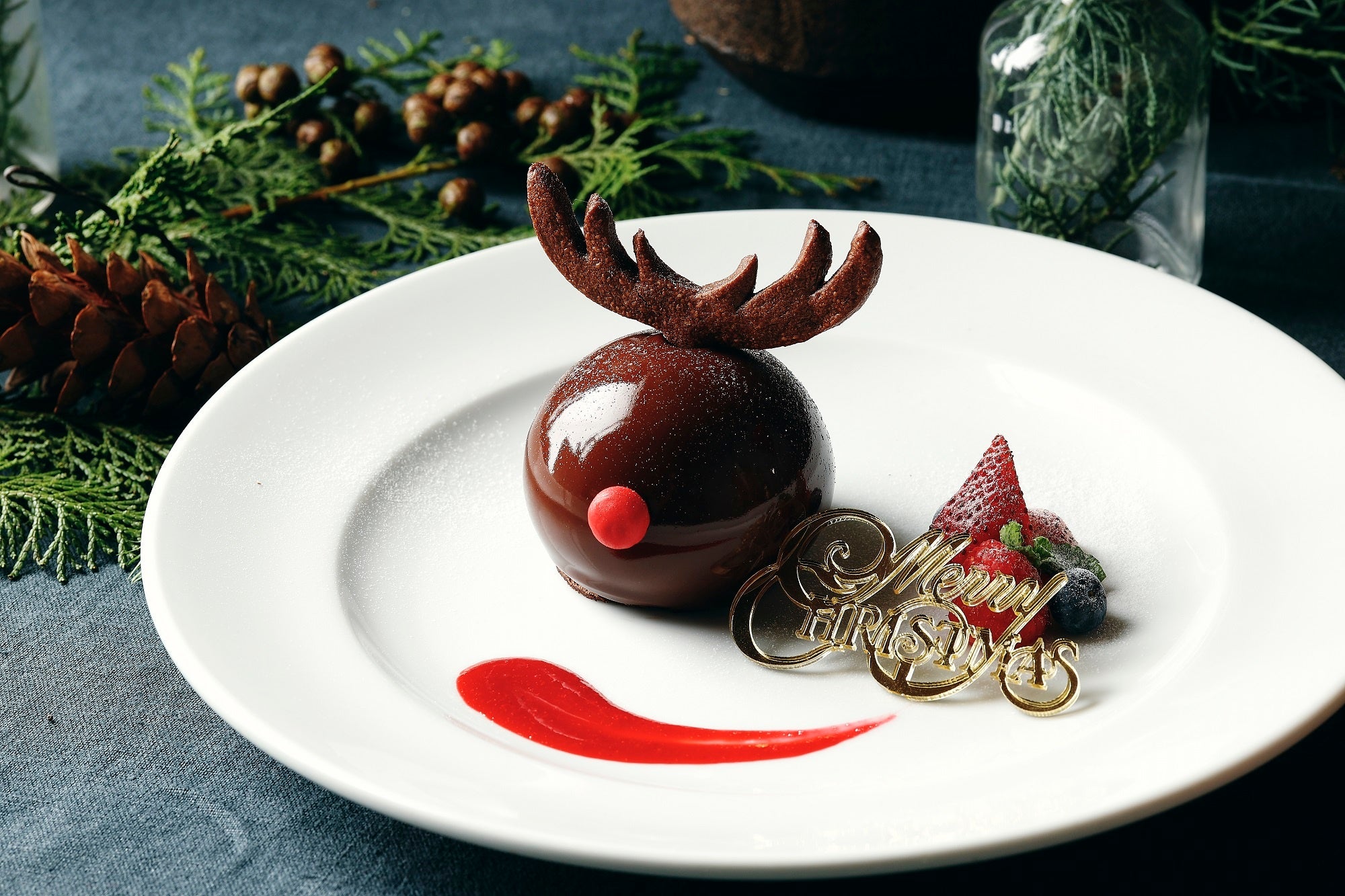 トナカイをモチーフにしたチョコレートムースのケーキ。ほろ苦いチョコレートムースの中央には甘酸っぱいカシスのジュレがアクセントで入っています。