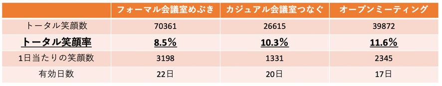3つの会議室ごとに計測された表情に対し、笑顔として判定・計測された笑顔率(認識された笑顔数/認識された全表情数を基軸に分析結果をまとめる