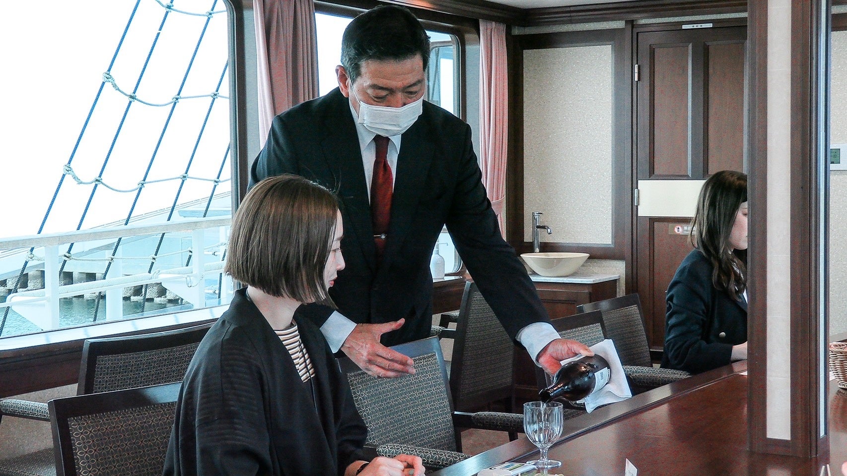 <特典>華やかな貴賓室を貸切し淡路島産のお酒やソフトドリンク、地元福良にあるクボタ水産の旬の鮮魚が織りなすお刺身などをご用意し贅沢なひとときをお楽しみいただけます。船長からの挨拶やブリッジ見学、船長服で記念撮影、専属スタッフ同行により船旅がより一層有意義なものになるようサポートします。