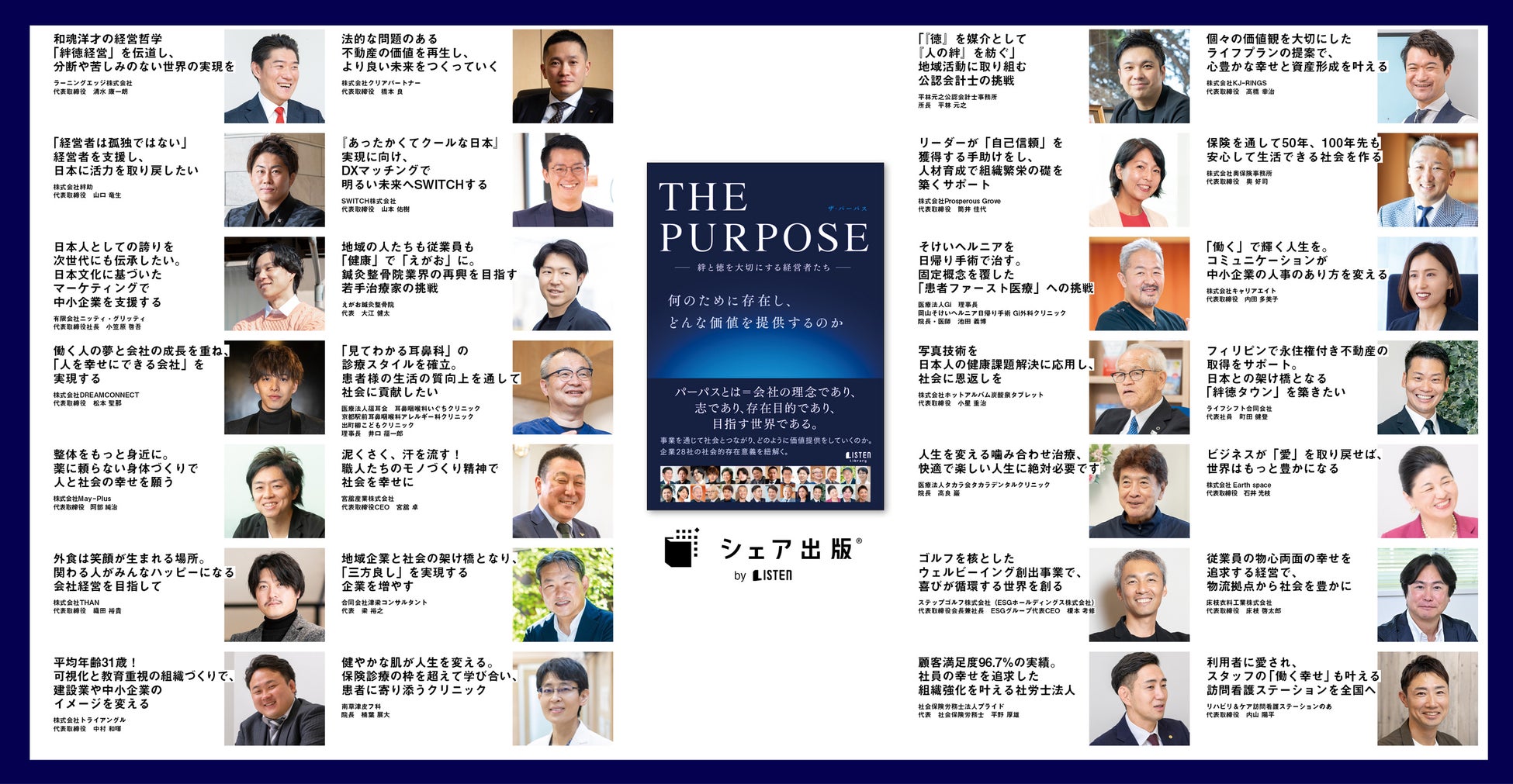 経営者を中心に累計3,000名以上へインタビューを行い、書籍出版やウェブメディア運営を行うリスナーズ株式会社(東京都新宿区、代表者:垣畑 光哉、以下「当社」)は、28法人の代表の社会への貢献価値・存在意義・志をまとめた、『THE PURPOSE ー 絆と徳を大切にする経営者たち ー』をAmazon.co.jpより12月4日(水)に出版します。