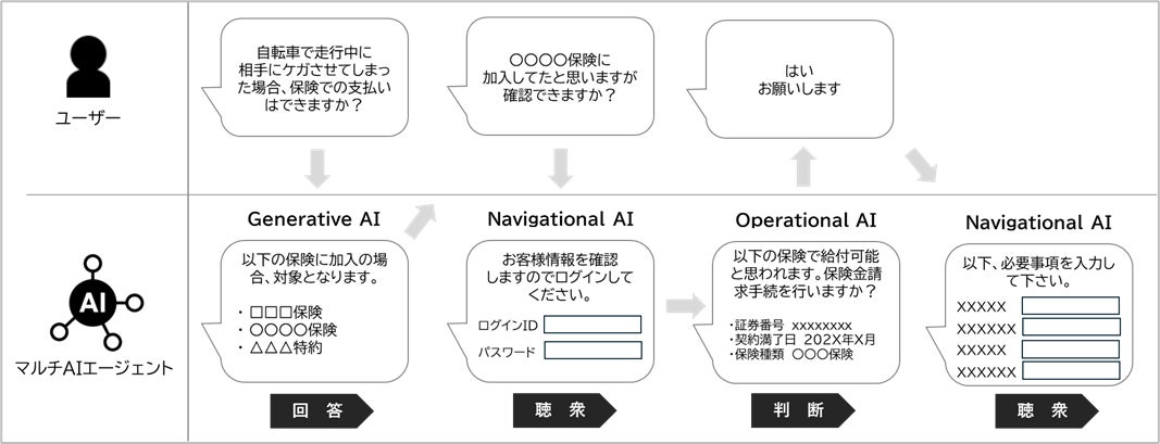 例えば、損害保険業界では、契約者からの保険金の請求可否に関する問い合わせに対し、Generative AIが規約やFAQを参照して最適な回答を生成します。追加の質問に対してはNavigational AIが必要な情報を収集し、そのままOperational AIが請求手続きをガイドする、といった連携が可能で、ユーザーの多様なニーズに対し一連の流れをマルチAIエージェントで対応できます。また、必要に応じて有人(エージェント:Human)へエスカレーションも行われ、ユーザー体験の最適化を図ることが可能です。