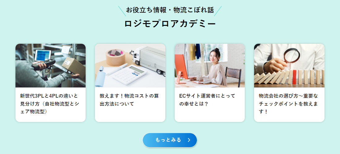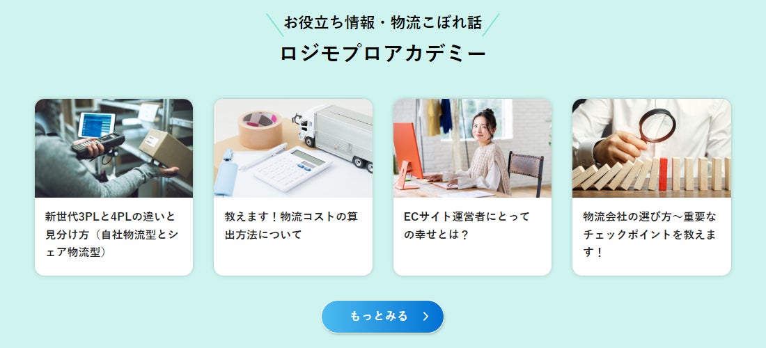 リニューアルされたホームページには利用されているユーザー様のインタビューの他、物流関連のお役立ち情報や知識を発信する「ロジモプロアカデミー」など、これまでなかったコンテンツが新たに追加されています。