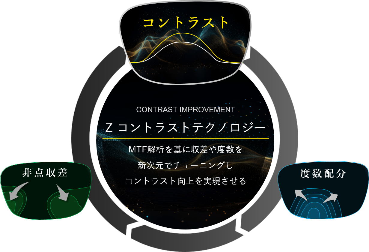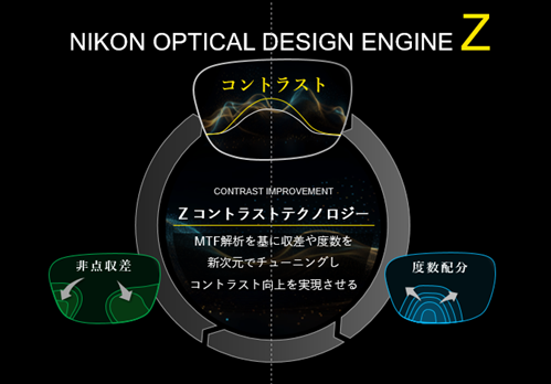 そこでニコンは、カメラレンズの評価に使われてきたMTF(Modulation Transfer Function)解析をメガネレンズの性能評価に取り入れることで、コントラストという評価基準を新たに設定。見たいものに対して、最適なコントラストが得られる、ニコン独自の全く新しい光学設計エンジン「Zコントラストテクノロジー」を開発し、累進レンズ特有の歪みを抑えつつ、コントラストの向上を実現。ピントが合わせやすく、小さな文字もくっきりと見える累進レンズに生まれ変わりました。