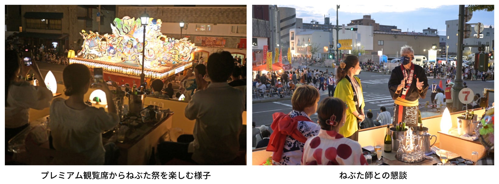 当観覧席では、ホテル青森の敷地内に設けた横5.5m、奥行き7.2m、高さ2.5mの2階建ての大型桟敷席からねぶたを見渡せる特別な体験をご提供しました。100万円席の利用客は地元特産のお酒や食事を楽しみながら、同席したねぶた師(5日:手塚茂樹氏、6日:竹浪比呂央氏)による解説に耳を傾け、目の前をねぶたが通過する度に写真におさめながら、大きな拍手を送っていました。「快適な空間で人混みをかき分けずに見られて、プライスレスな体験でした」「ねぶた師さんの解説もとてもわかりやすく、桟敷席も今までで経験したことがない高い位置にあり、新しい視点から観ることができました」と好評を博しました。