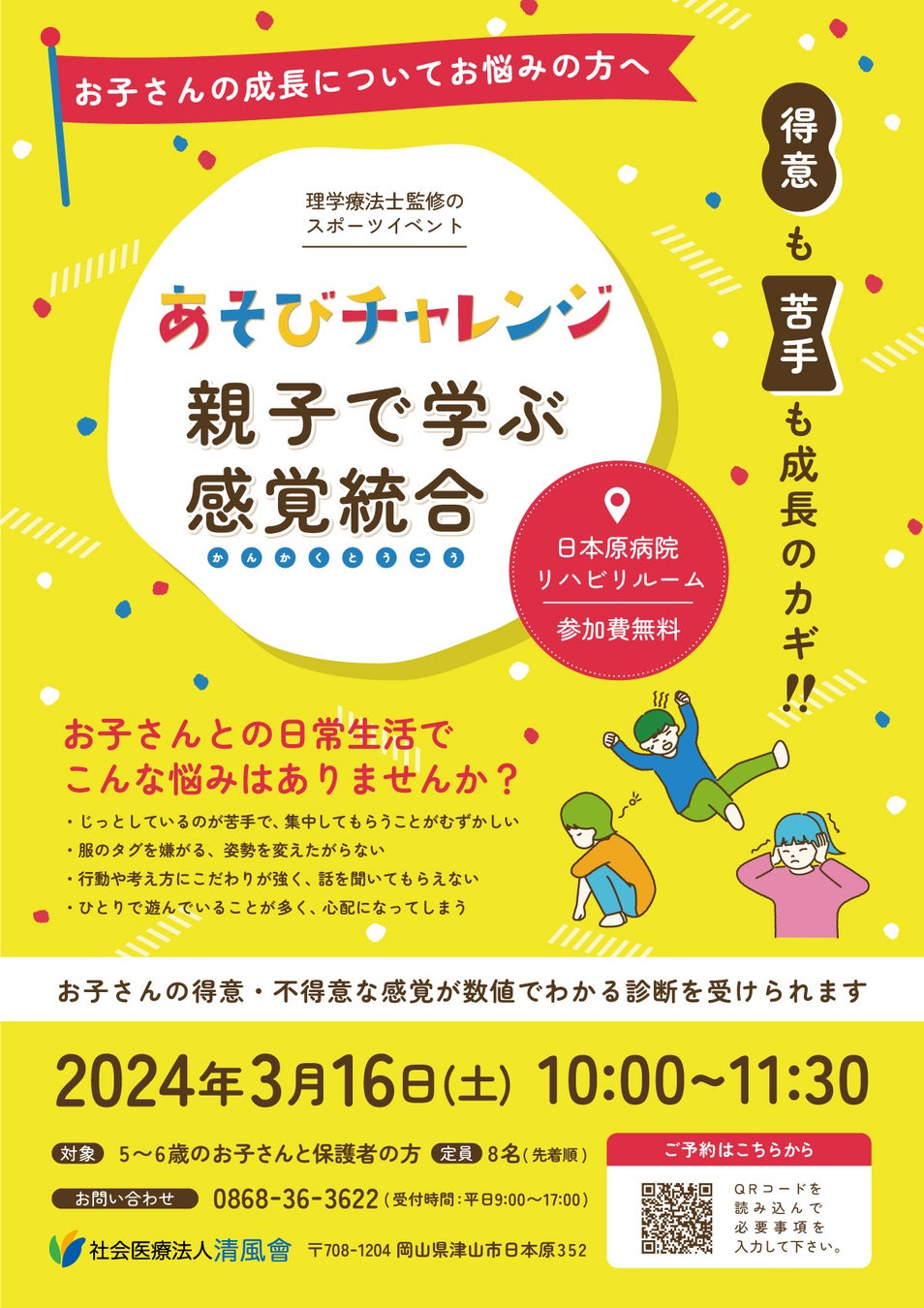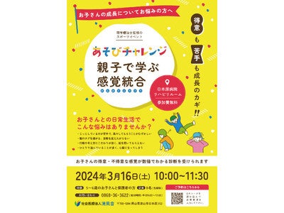 社会医療法人清風會(本部:岡山県津山市、理事長:森崇文)では2024年3月16日(土)に発達障害と診断はされていないけれど「まわりの子より運動が苦手かも」など子どもの運動能力に対して不安があるというご家庭を対象に、検査や様々なあそびを通じて子どもの感覚や刺激への理解と、自宅でできる感覚統合運動を学ぶ「あそびチャレンジ」を開催します。