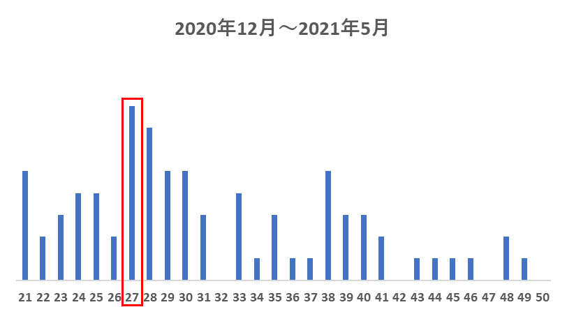 続いて、具体的な年齢を見てみました。ご入会者数がもっとも多い年齢は25歳でした。2年前は27歳だったため、2歳若齢化しています。しかし平均年齢は、平均年齢も31.8歳から33.0歳へと少しだけあがっています。早くに始める方が増えてはいるものの、40代以上の方の利用割合が増加していることが要因かもしれません。