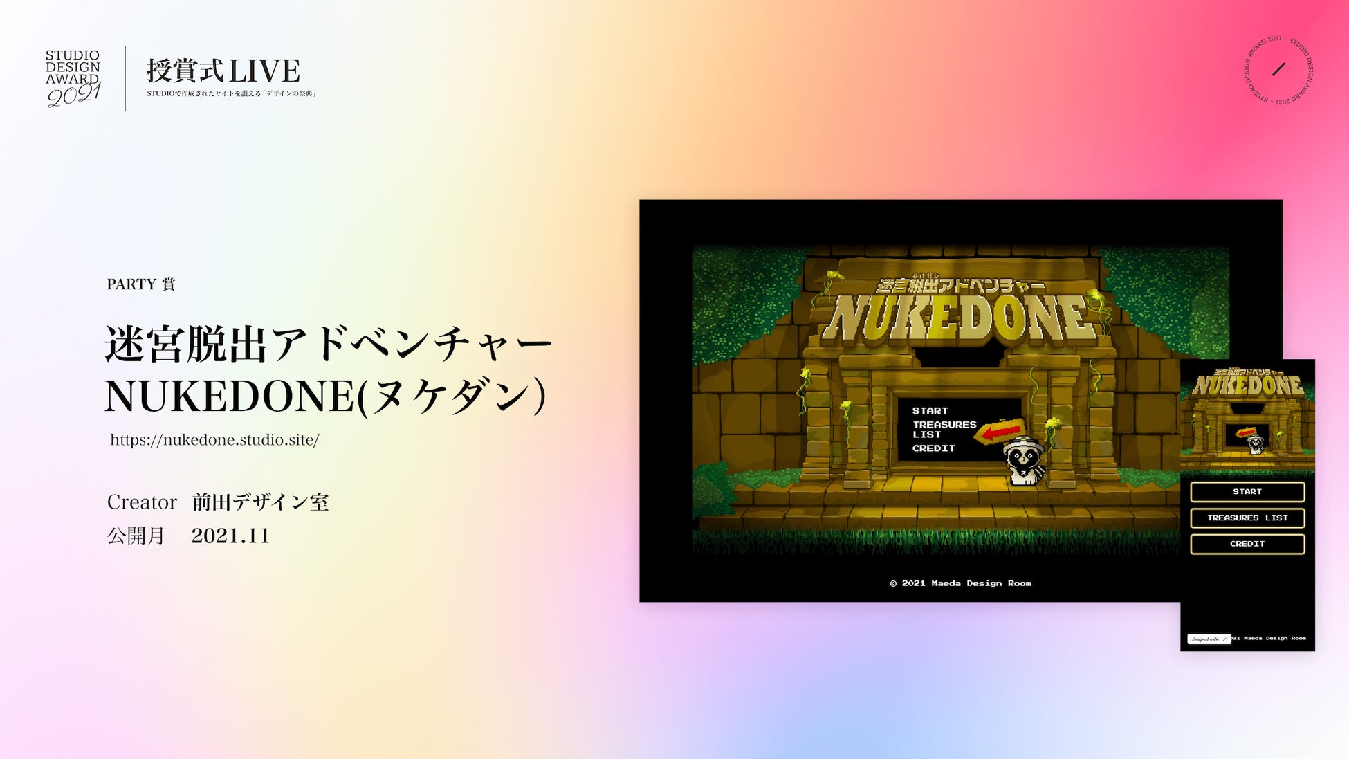 まず、ノミネート群を見て驚きました。STUDIOは、ここまでできるのかと。 従来のWeb制作では「モーションセンスのあるコーダー」が求められました。デザイナー一気通貫でWeb制作の門戸を開くサービスに昇華したなと。 「迷宮脱出アドベンチャー NUKEDONE」は、選択式RPG的なUIで、Web来訪者の異なるターゲットに、妥当なコンテンツを届けるという、新たなSTUDIOの可能性を切り開いていました。