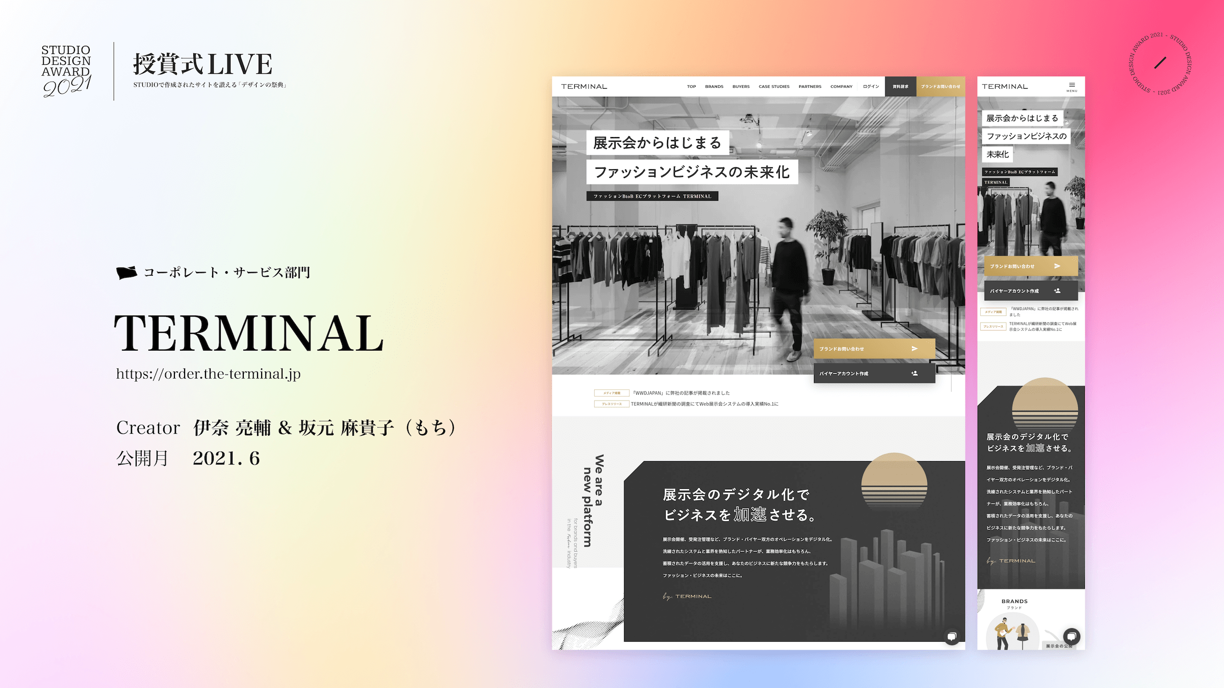17件と最も多くのサイトがノミネートされたコーポレート・サービス部門では、受賞作として「TERMINAL」公式サイトを選出しました。 華やかな演出で彩られながらも、サービスサイトとして伝えるべき情報がわかりやすく整理されており、ストレスなく楽しく閲覧することができる素晴らしいサイトです。デザイン面では、特に全体のモーションデザインのバランス感覚が素晴らしく、サイト閲覧体験を通してショッピングをするときのような高揚感を覚えさせます。 感度の高いファッション業界で戦うサービスに相応しいハイセンスな本作は、多数のノミネート作品の中でも頭ひとつ抜けたクオリティでした。