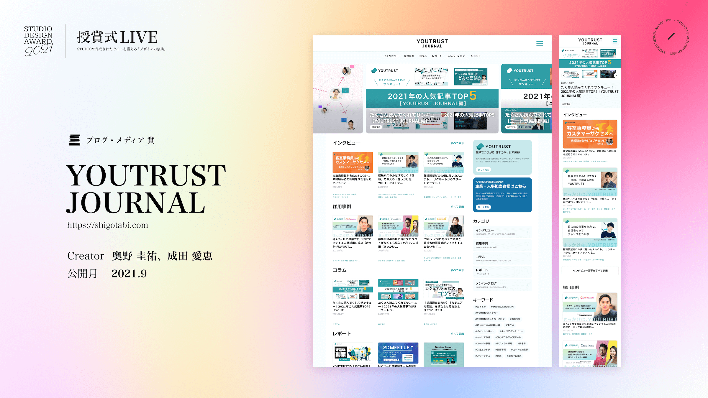 CMS機能のリリースから1年以上が経過し、今回のアワードには大規模なメディアサイトが複数ノミネートされました。中でもSTUDIOの特徴であるデザイン表現の自由さと、中身のメディアとしての圧倒的なボリュームを両立した「YOUTRUST JOURNAL」を、本年度のブログ・メディア賞に決定しました。爽やかに統一されたデザイントーン、メディア訪問者の探索体験をよく考慮したカテゴリ設計に加え、程よく設定されたアニメーションが全体のクオリティを一段引き上げています。生きて運用されるSTUDIO CMS製メディアの好例をデザインアワードで表彰できたこと、大変嬉しく思います。