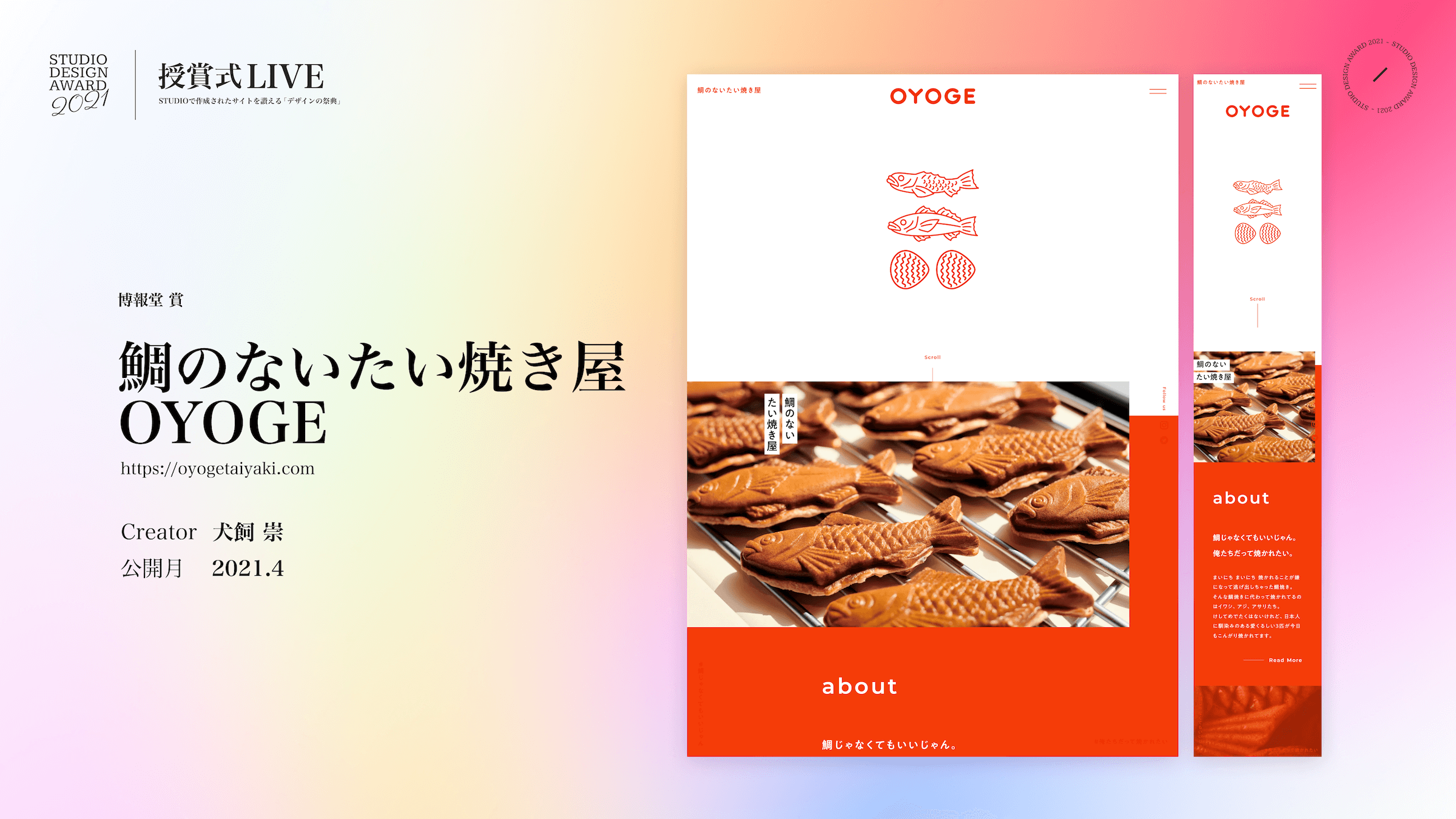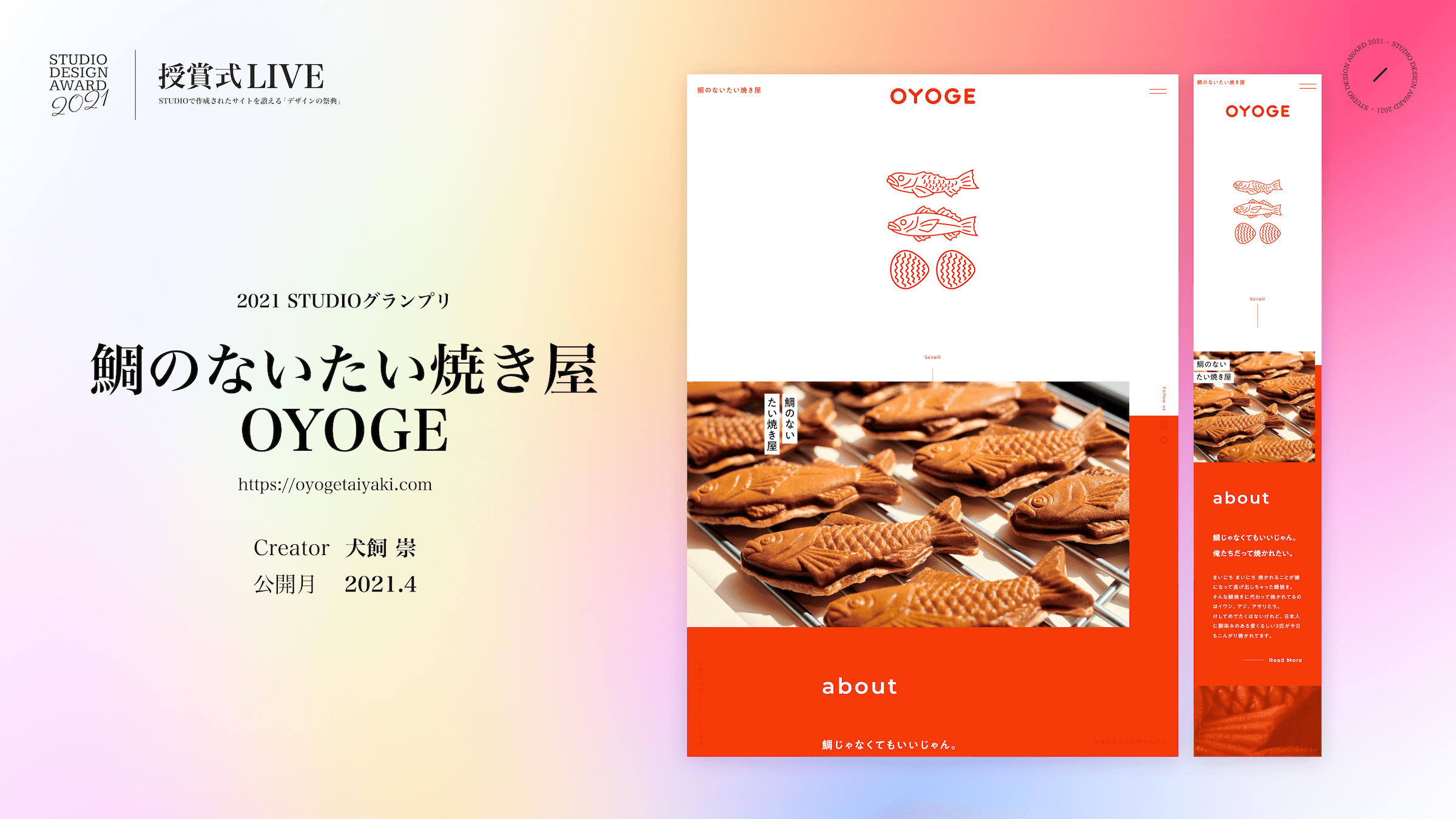 STUDIO DESIGN AWARD 2021、全227のエントリーの中からグランプリに選出されたのは、STUDIOの更なる可能性に気付かせてくれた、犬飼崇さん制作の店舗サイト「OYOGE」です。 「鯛のないたい焼き屋」というキャッチーなコンセプトが、gifアニメーション、アニメーション、動画、写真など多様な手段で見事にまとめ上げられ、シンプルなのに奥深く、どこまでも心地よい、理想的なWeb空間が広がっています。 オーナーであるOYOGEの方へはもちろん、携わった撮影チームや、訪問者、そしてSTUDIOチームまで、周囲にたくさんの良いインパクトをもたらした、今年の顔と言える素晴らしいサイトでした。