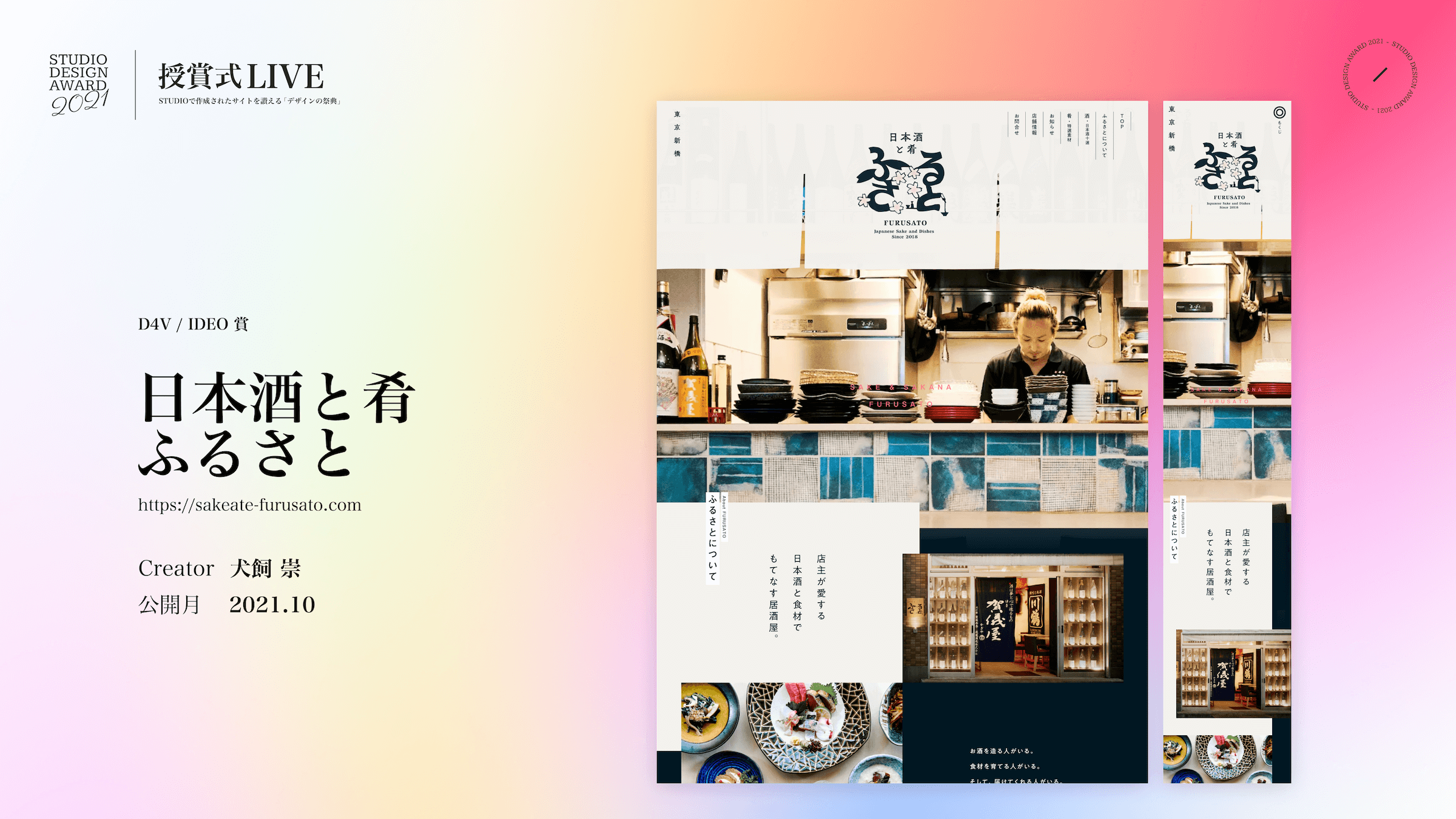 D4VとIDEOのデザイナーで全てのノミネート作品を楽しく拝見しました。 まず第一に、去年に輪をかけて質の高いサイトが増えたな、という印象があります。アニメーションやホバーなどSTUDIOの機能を工夫して使った作品が多く、表現の幅が確実に広がっていることを実感できました。 D4V/IDEO賞として今回、我々が選んだ作品は「日本酒と肴 ふるさと」です。 「店主が愛する日本酒と食材でもてなす居酒屋」という店のコンセプトに違わず、お酒を手にとって飲みたくなるような、まさに「もてなし」に似た体験をすることができるデザインに仕上がっています。 大きな評価ポイントの1つは、縦書きのレイアウトを巧みに使っている点です。ウェブレイアウトではコピーなどを横書きにするのが主流であるなか、本作では居酒屋の和のコンセプトを際立たせる縦書きがユーザビリティも考慮した形で絶妙に配置されています。例えば、目次の部分を見てみてください。目次には横書きのレイアウトを使うのが一般的ではありますが、このサイトではのれんの形状に合わせた縦書きのレイアウトが、まさに居酒屋に入っていくような臨場感を演出しています。 さらに、本作を通じた気付きとしてあったのは、モバイル版で 縦方向にスクロールしながら見ていく際に縦向きの文字列は無理なく読めるということです。 おすすめの日本酒を紹介している部分では縦長のシルエットを持つ一升瓶と縦書きの文字列がきれいに連動していて感心しました。 もう1つ本作の魅力として挙げられる点は、モバイル版で見る場合とデスクトップ版で見る場合とで、それぞれ微妙に異なる体験を提供していることです。デスクトップ版は酒屋に出向いた時のように、いくつもの酒瓶が並び、それぞれの差異がひと目で見て取れるように設計されています。一方、モバイル版は一瓶、一瓶をじっくりと見ていけるような作りになっていて、それぞれのお酒の魅力に向き合うことができました。 一升瓶をクリックして個別の紹介ページに遷移する際のアニメーションもよく作り込まれており、そのお酒の世界観に引き込まれていく感覚がありました。 STUDIOを長年支援させてもらっている立場から、STUDIOで作った様々なサイトやページが日本中で公開され、国内クリエーターの中にファンが増え続けていることを非常に嬉しく思います。 日本国内のみならず、海外への飛躍も期待しつつ、弊社も良きパートナーであり続けられるよう努めて参ります。