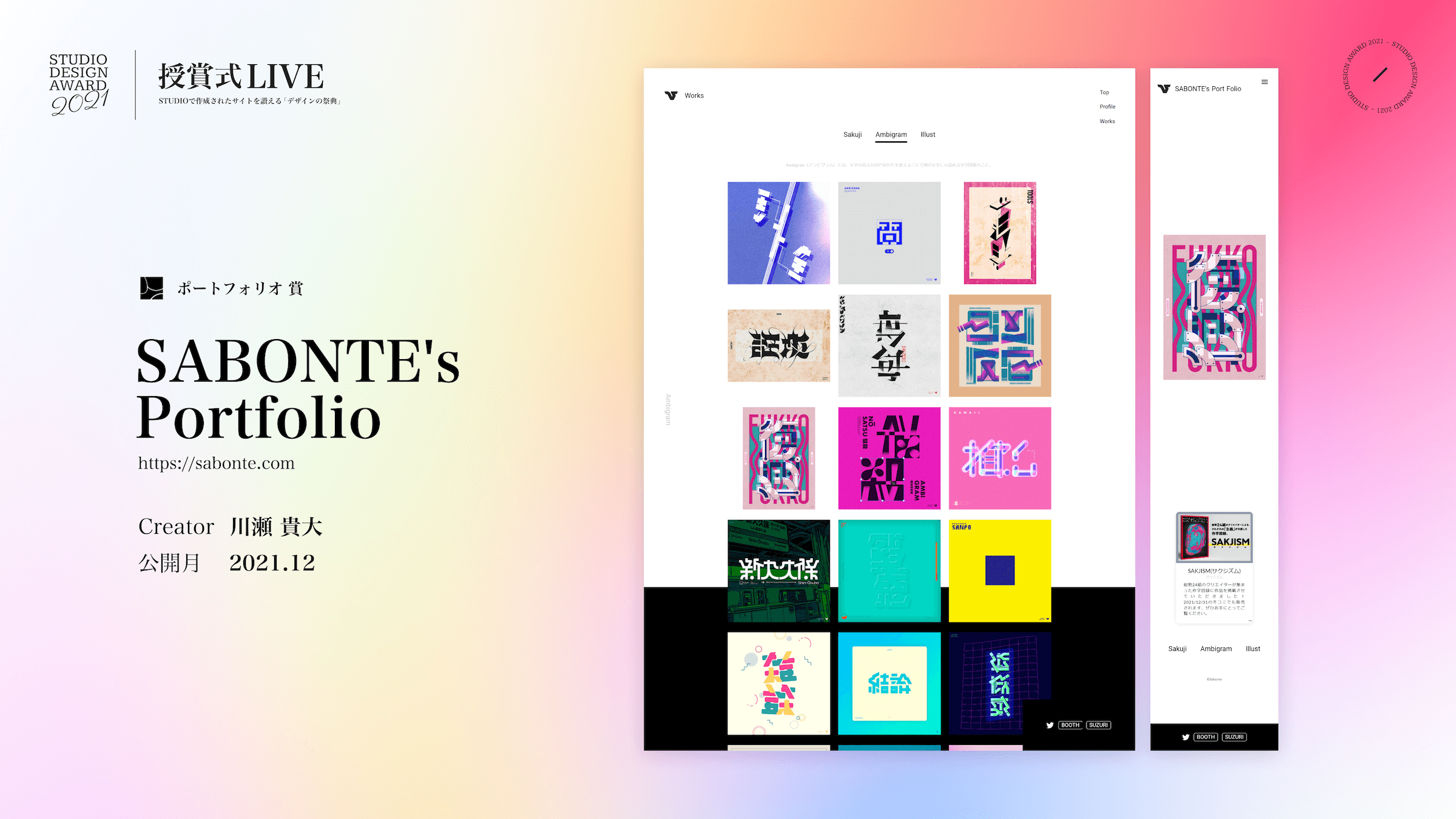 ポートフォリオサイト部門では、大きく「掲載作品の編集力」「サイトそのもののクオリティ」という2つの評価軸で審査しました。 SABONTE’s Portfolioは、クオリティの高い作品群がそれぞれ効果的な見せ方で配置され、サイト全体の動きも楽しく、総合的に評価の高いサイトでした。ニュース欄の作り方や動線も、ご本人の活動内容とのバランスのよい優れた設計で、ミニマルながら安心して作品の楽しめる空間となっています。 何より、一つ一つを最もよい形で訪問者に見てもらいたいという作品への愛が、唯一無二の工夫として昇華されていた本サイトを、2021年のポートフォリオ賞に決定しました。
